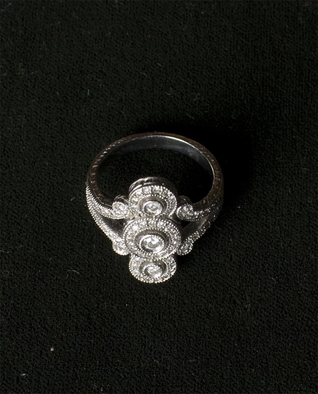 The setting 14K white gold with three conjoined circles, the center one set with a transitional diamond weighing app. .25cts, flanked by 2 app. .20cts, with the remainder of the setting with 63 small diamonds entwining the whole ring. Total weight of the ring is 5 grams,size 7.
