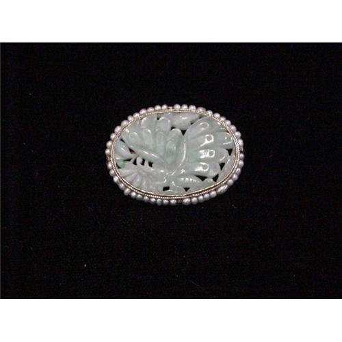 Exquisite Circa 1920 Art Deco carved jadeite, pearl and 14kt yellow gold brooch with pearl surround mount, carved jadeite depicting a butterly in flight. Lovely piece. Very pretty look. Reverse: lever safety catch, ball hinge (replacement hinge). Beautiful piece. Nice jade. Lovely natural pearls!!