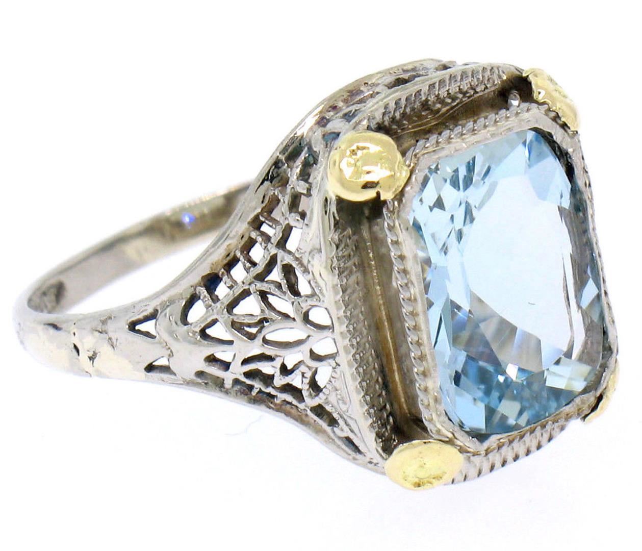 One Antique Art Deco 14k Two Tone Gold 2.50ct Cushion Blue Aquamarine Filigree Ring. Item Details: Material: Solid 14K White and Yellow Gold, Weight: 2.6 Grams, Stone(s): (1) Natural Genuine Aquamarine - Rectangular Cushion Cut - Bezel Set - Medium Blue Color - 7.92mm x 9.76mm, Total Carat Weight: 2.50 (approx.), Ring Size: 5.75 (We can custom size this ring.), Ring Top Dimensions: 12.61 x 12.29mm, Condition: Antique, early art deco period piece. Excellent condition!