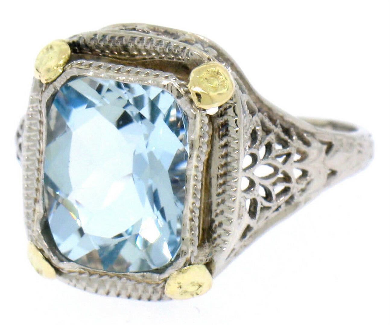 One Antique Art Deco 14k Two Tone Gold 2.50ct Cushion Blue Aquamarine Filigree Ring. Item Details: Material: Solid 14K White and Yellow Gold, Weight: 2.6 Grams, Stone(s): (1) Natural Genuine Aquamarine - Rectangular Cushion Cut - Bezel Set - Medium Blue Color - 7.92mm x 9.76mm, Total Carat Weight: 2.50 (approx.), Ring Size: 5.75 (We can custom size this ring.), Ring Top Dimensions: 12.61 x 12.29mm, Condition: Antique, early art deco period piece. Excellent condition!
