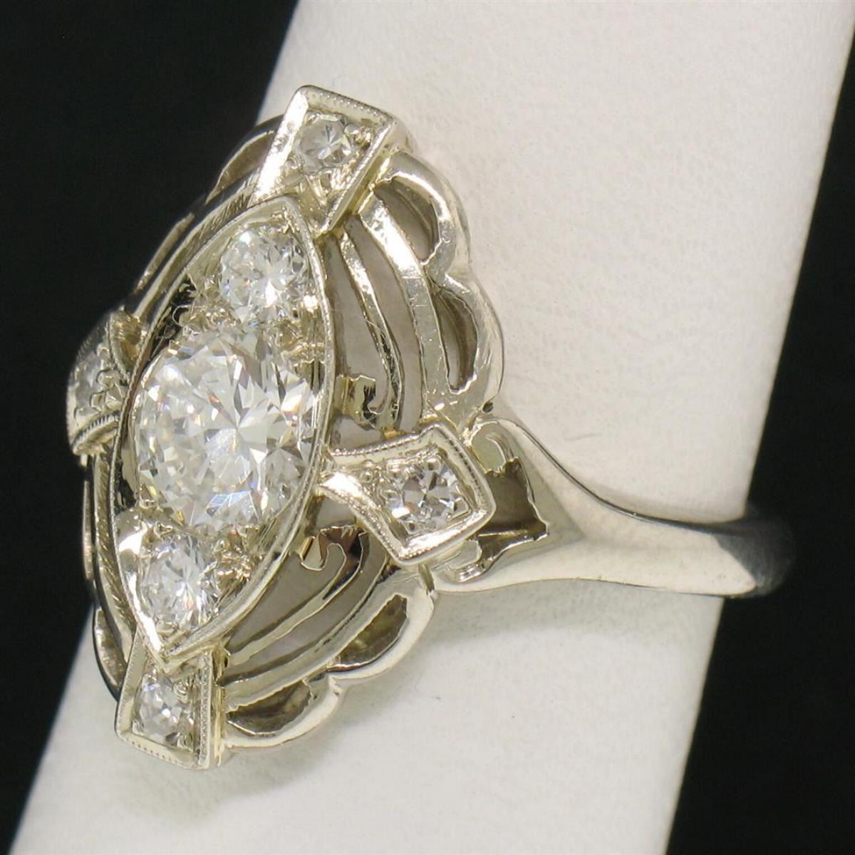One Antique Art Deco Large 14k White Gold 0.85ctw Diamond Open Work Dinner Ring. Item Details: Material: Solid 14k White Gold, Weight: 3.8 Grams, Stone(s): (1) Natural Genuine Diamond - Old European Cut - Prong Set - G Color - VVS2 Clarity - 0.68ct (approx.), (6) Natural Genuine Diamonds - Round Transitional Cut - Pave Set - G Color - VS1 Clarity - 0.17ctw (approx.), Total Carat Weight: 0.85 (approx.), Ring Size: 5.5 (We can custom size this ring.), Ring Width: 17.8mm, Condition: Antique art deco period ring. Excellent, ALL ORIGINAL condition; A TRUE TREASURE!