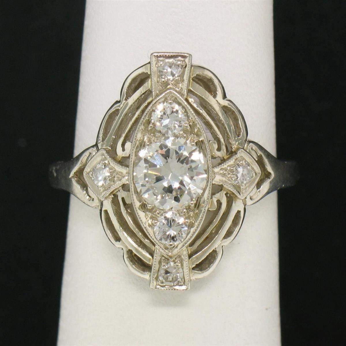 One Antique Art Deco Large 14k White Gold 0.85ctw Diamond Open Work Dinner Ring. Item Details: Material: Solid 14k White Gold, Weight: 3.8 Grams, Stone(s): (1) Natural Genuine Diamond - Old European Cut - Prong Set - G Color - VVS2 Clarity - 0.68ct (approx.), (6) Natural Genuine Diamonds - Round Transitional Cut - Pave Set - G Color - VS1 Clarity - 0.17ctw (approx.), Total Carat Weight: 0.85 (approx.), Ring Size: 5.5 (We can custom size this ring.), Ring Width: 17.8mm, Condition: Antique art deco period ring. Excellent, ALL ORIGINAL condition; A TRUE TREASURE!
