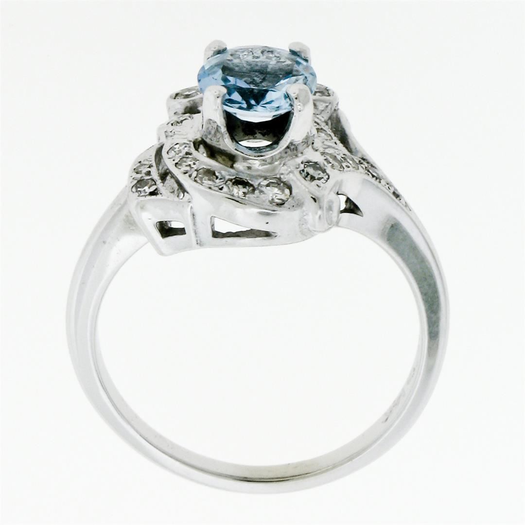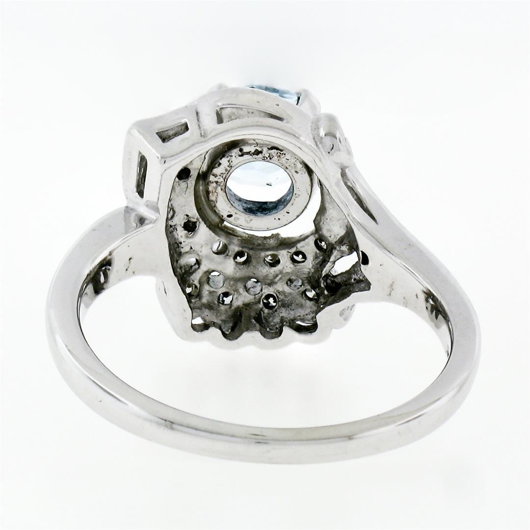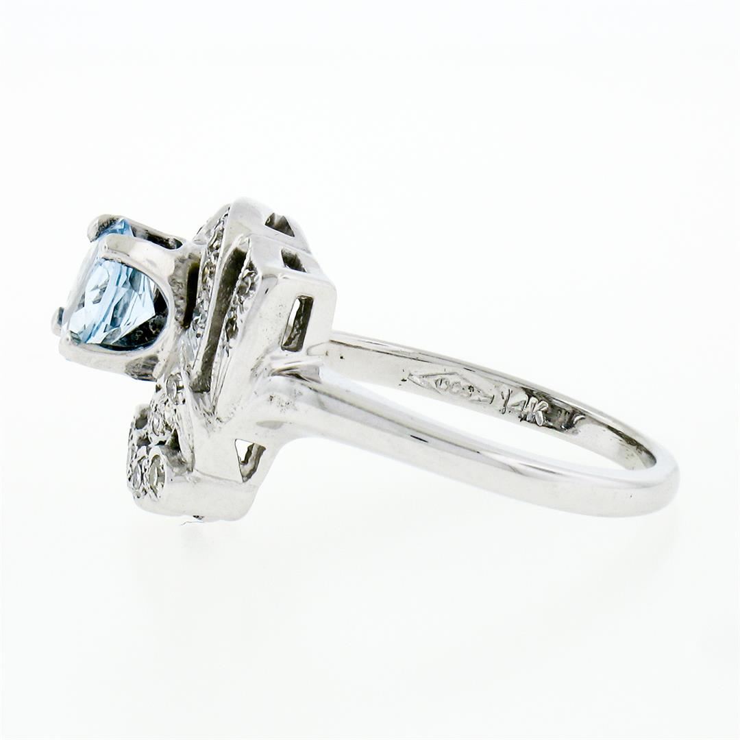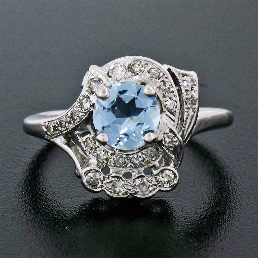 An art deco period 14k white gold cocktail ring with a 1.00ct round aquamarine prong set at the center and 0.45ctw of round single cut diamonds (G to I - VS1/VS2) pave set around it. The ring is size 6.5, weighs a total of 4.55 grams, and measures 13.35m