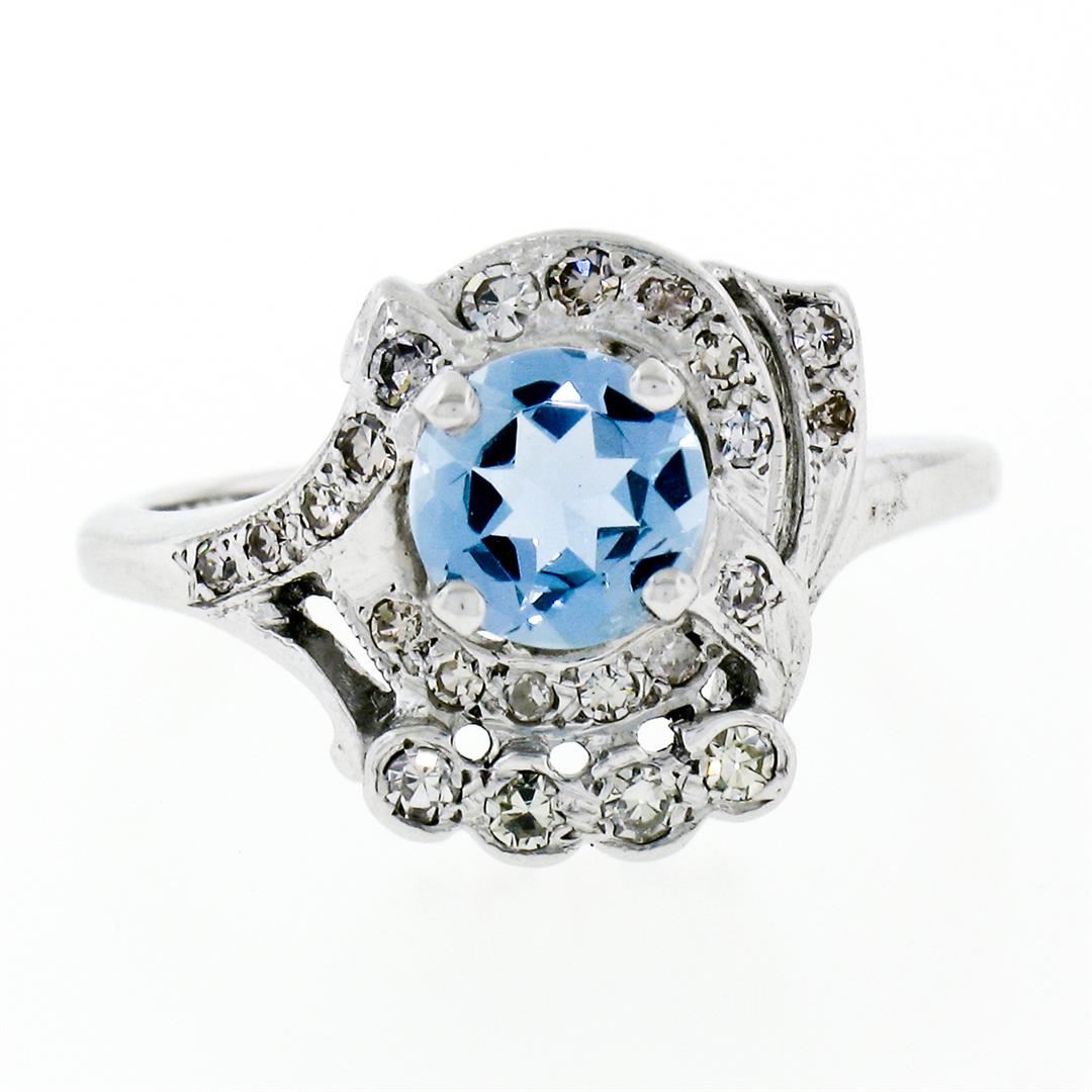 An art deco period 14k white gold cocktail ring with a 1.00ct round aquamarine prong set at the center and 0.45ctw of round single cut diamonds (G to I - VS1/VS2) pave set around it. The ring is size 6.5, weighs a total of 4.55 grams, and measures 13.35m