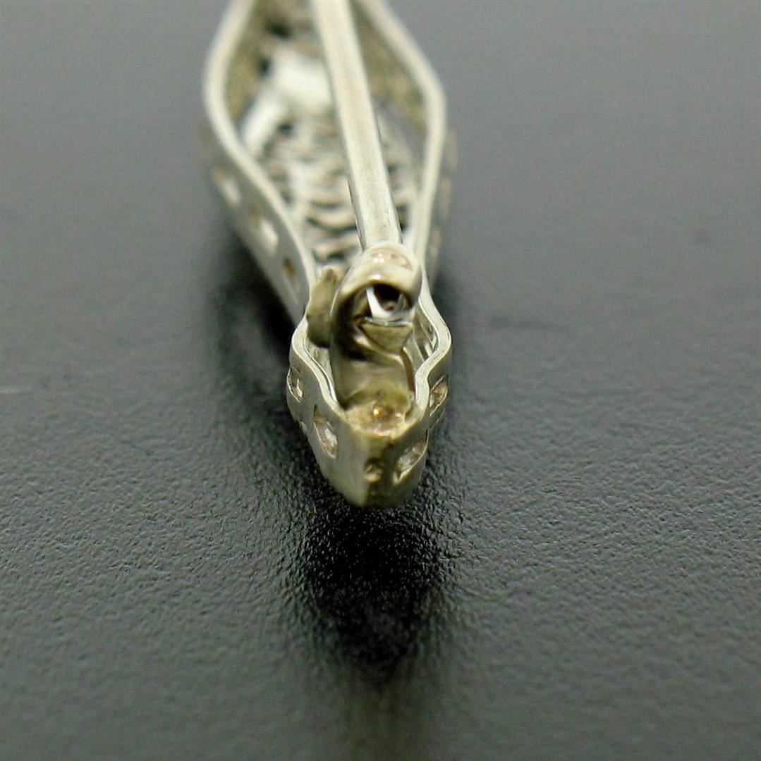 One Art Deco 14k White Gold Open Filigree Milgrain Bar Pin Brooch w/ 4pt Euro Diamond. Item Details: Material: 14k Solid White Gold, Total Weight: 3.3 Grams, Stone(s): (1) Natural Genuine Diamond - Round European Cut - Prong Set - I/J Color - SI1 Clarity - 0.04ct (approx.), Overall Height: 7.46mm, Overall Width: 63.18mm, Overall Thickness: 4.33mm, Condition: Antique, art deco period piece. Great condition!