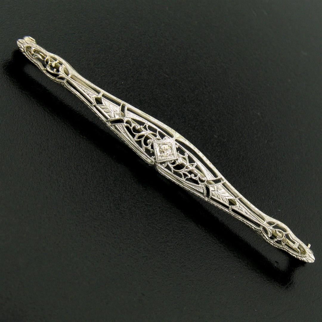 One Art Deco 14k White Gold Open Filigree Milgrain Bar Pin Brooch w/ 4pt Euro Diamond. Item Details: Material: 14k Solid White Gold, Total Weight: 3.3 Grams, Stone(s): (1) Natural Genuine Diamond - Round European Cut - Prong Set - I/J Color - SI1 Clarity - 0.04ct (approx.), Overall Height: 7.46mm, Overall Width: 63.18mm, Overall Thickness: 4.33mm, Condition: Antique, art deco period piece. Great condition!