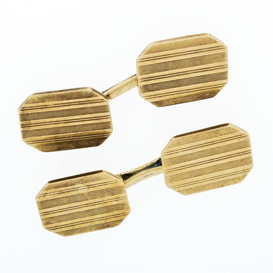 14k yellow gold art deco period cuff links with a fine grooved pattern. These cuff links have a dual panel design with a clearance of 21.85mm, weigh a total of 9.22 grams, and the front panels measure 14.25x12.00mm.