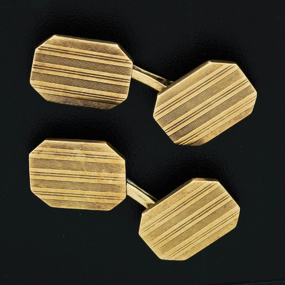 14k yellow gold art deco period cuff links with a fine grooved pattern. These cuff links have a dual panel design with a clearance of 21.85mm, weigh a total of 9.22 grams, and the front panels measure 14.25x12.00mm.