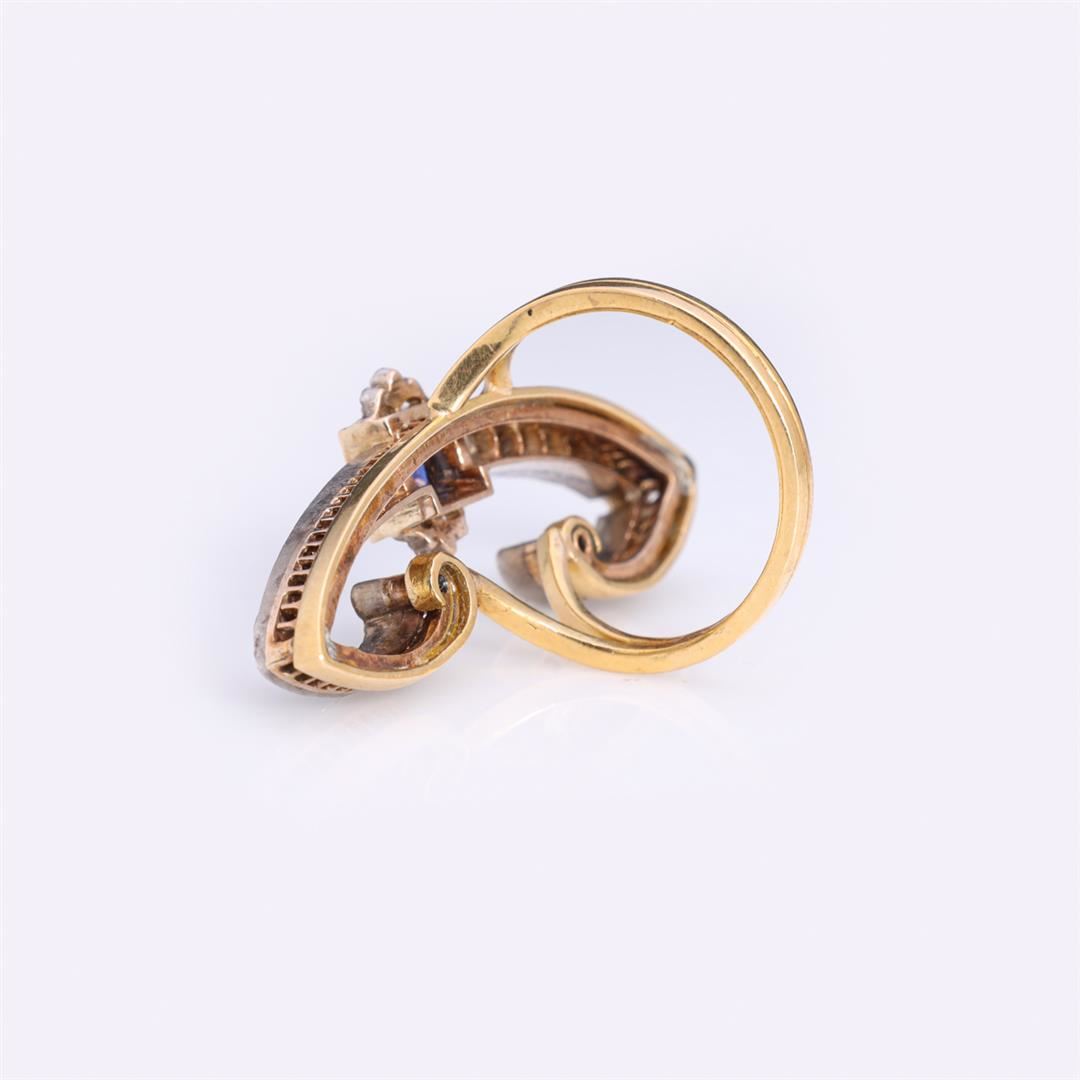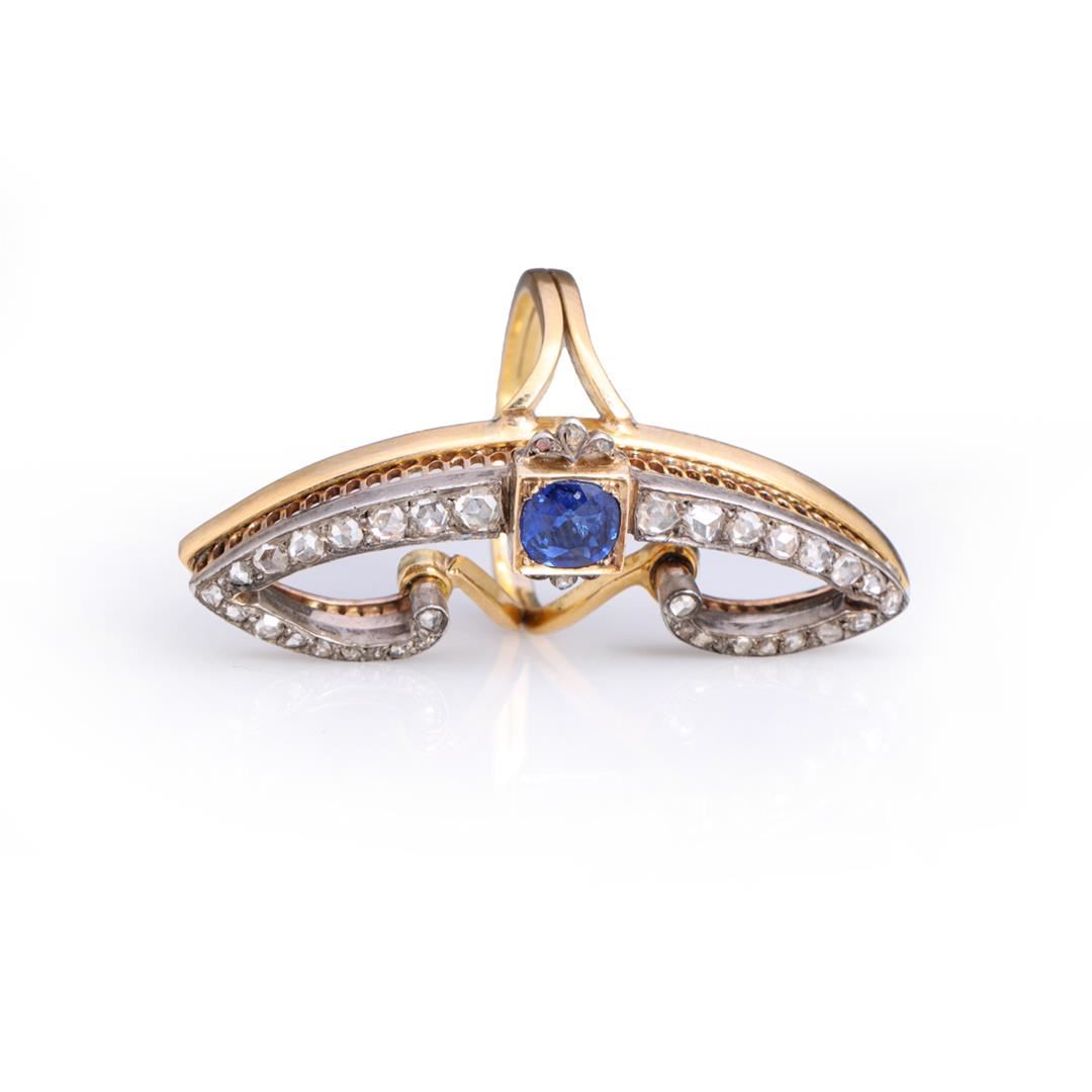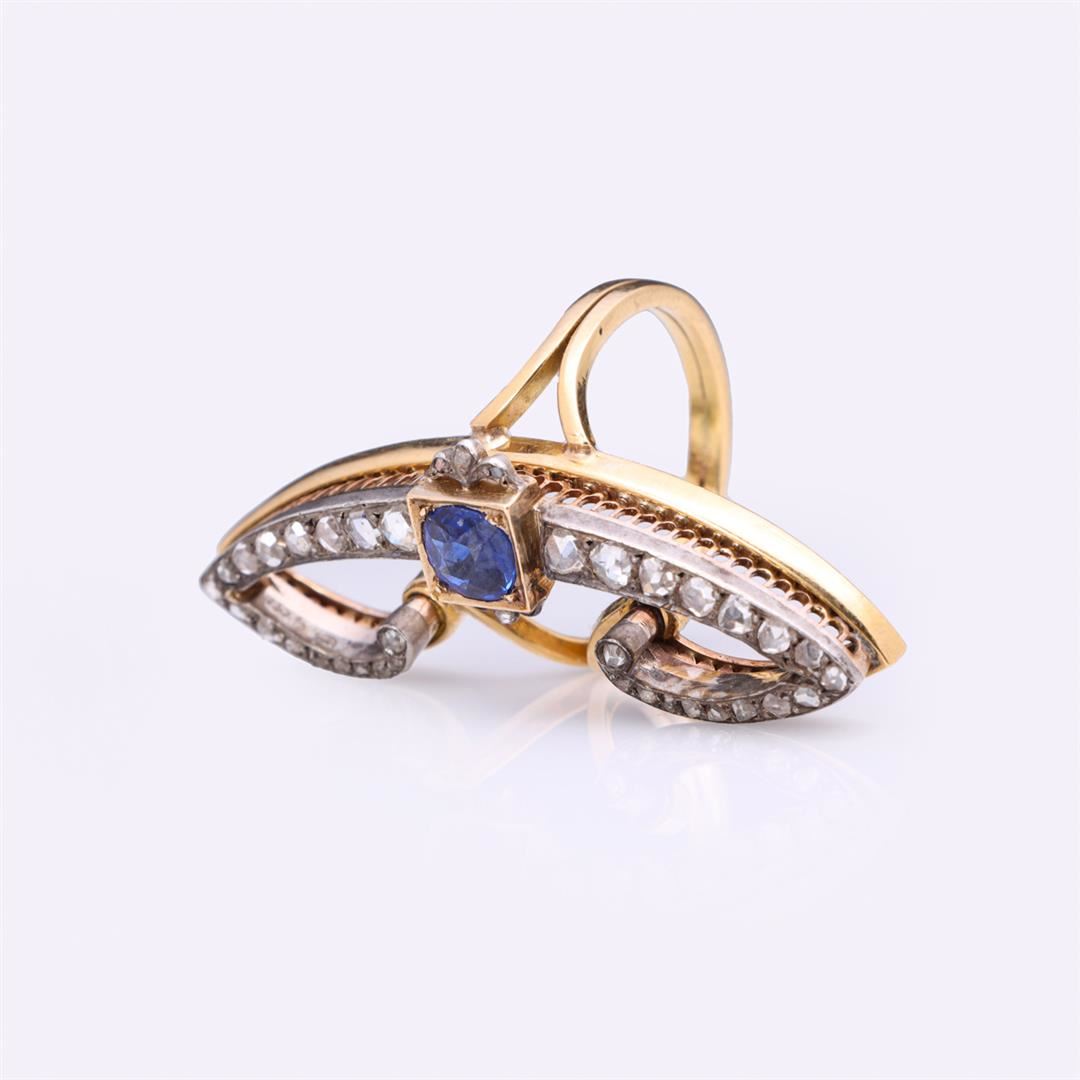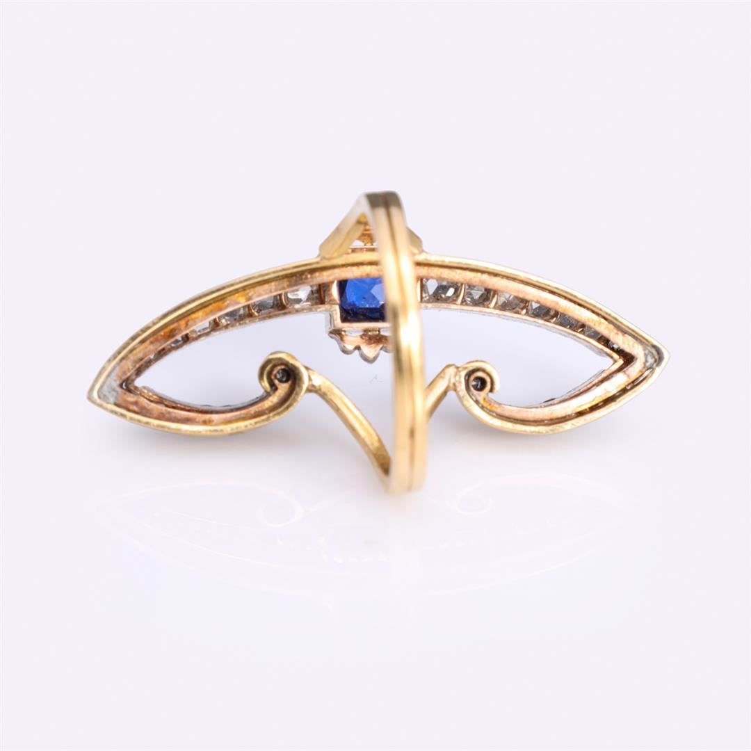 Vintage art deco cocktail ring in the form of a stylized butterfly in 18k gold, split bands on each side with central old cut blue sapphire, claw set in square frame, to each side a pair of stylized wings each set with graduating rose cut diamonds in plat