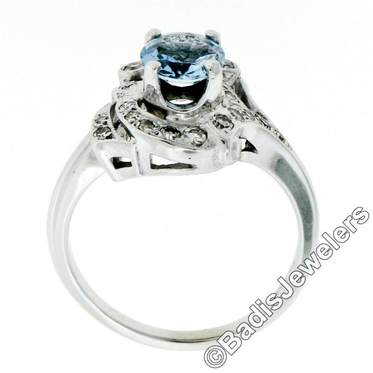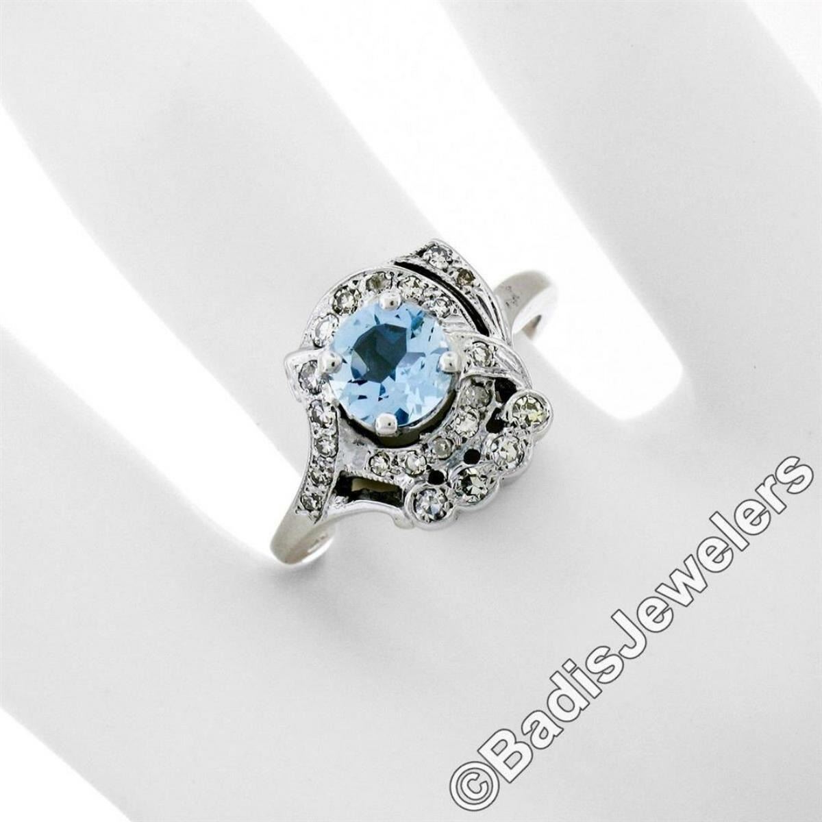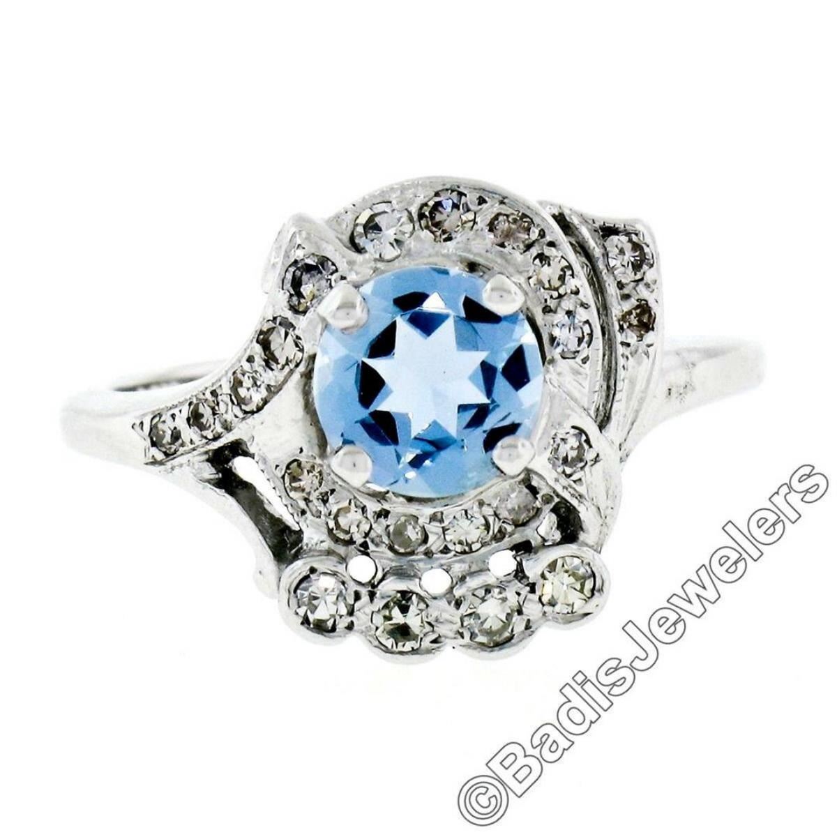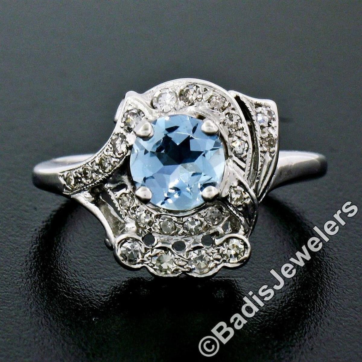 An art deco period 14kt white gold cocktail ring with a 1.00ct round aquamarine prong set at the center and 0.45ctw of round single cut diamonds (G to I - VS1/VS2) pave set around around it. The ring is size 6.5, weighs a total of 4.55 grams, and measures 13.35mm wide.