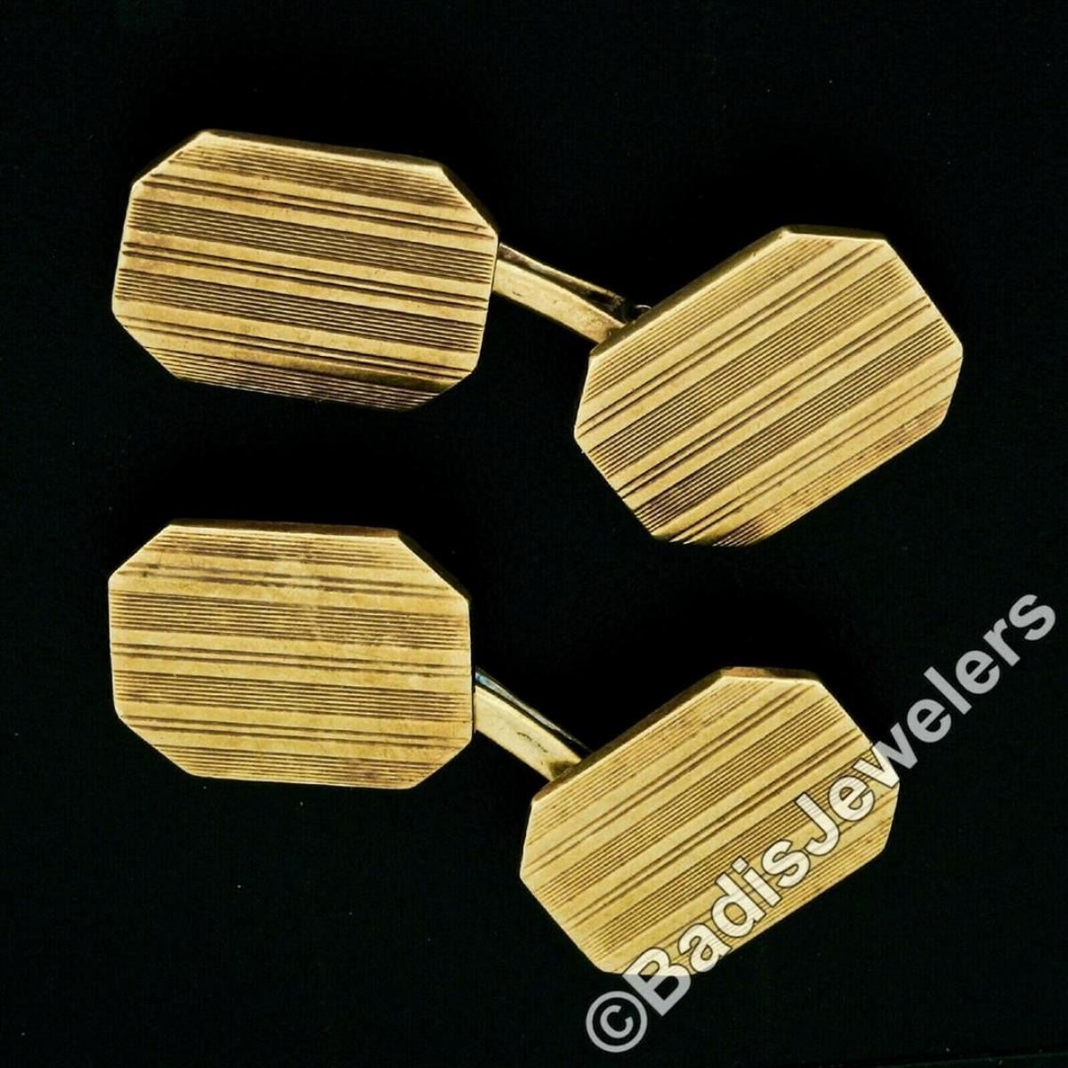 14kt yellow gold art deco period cuff links with a fine grooved pattern.These cuff links have a dual panel design with a clearence of 21.85mm, weigh a total of 9.22 grams, and the front panels measure 14.25x12.00mm.