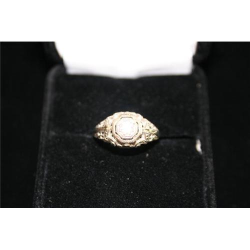 A substantial and beautiful Art Deco diamond ring.  The filigree is unusually detailed and in excellent condition, with little or no wear.  The diamond is very bright and weighs .33 cts.  Enjoy!
