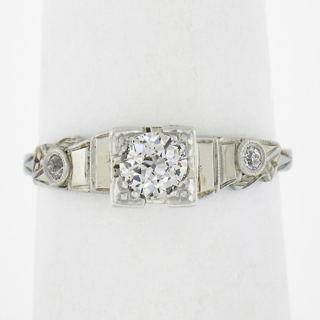 An antique solid 18k white gold engagement ring, with 1 old european cut natural diamond (G - SI1 ; 0.36ct), and 2 old european cut natural diamonds (G - SI1 ; 0.04ctw). The ring is size 6.5, weighs a total of 2.66 grams, and measures 5.7mm wide.