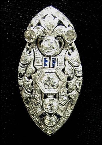 Art Deco 18k white gold diamond and sapphire pin; center diamond measures approximately 45 points with one 40 point stone above; and one 35 point stone below; three 15 point stones at top and one at the bottom; body is set with approximately forty small diamonds and calibre sapphires; pin measures 1 3/4" high by 3/4 wide; pin back is 14k; weight 5.9 dwt/9.2 grams; no visible defects