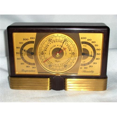 Art Deco Bakelite 3 in 1 Barometer, Thermometer, Humidity Gauge. Made by Taylor Instrument Co., Rochester, New York in 1926-27. Patent No. 1612344. Made with maroon-brown bakelite, metal and glass. The face has the 3 gauges in two tone gold. The back is maroon tin with a goldtone gauge to set the instruments altitude to your locality. Condition is very very good, with 2 very small scratches on the bottom underside. In full working order. An excellent piece for any collection. Very Art Deco. See photos. Take a glance at my other items. Thank you for viewing.