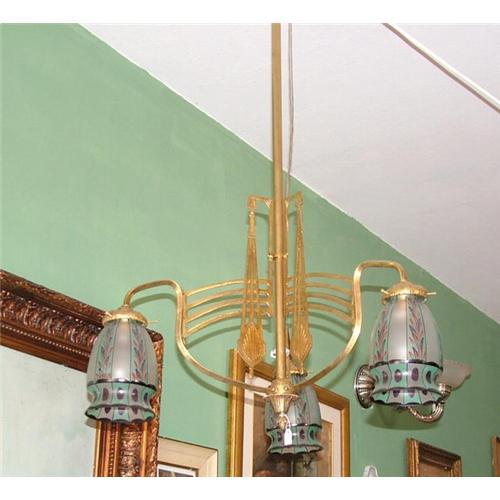 Unusual Art Deco 3 lights chandelier, restored and rewired, in very good conditions , a rare piece with hand painted crystal shades .