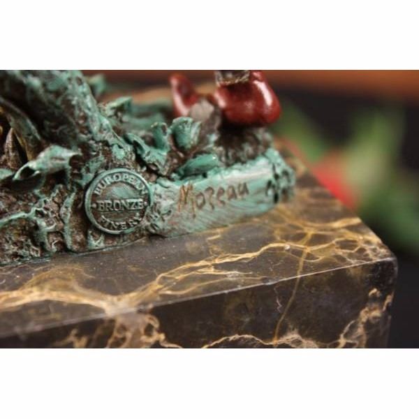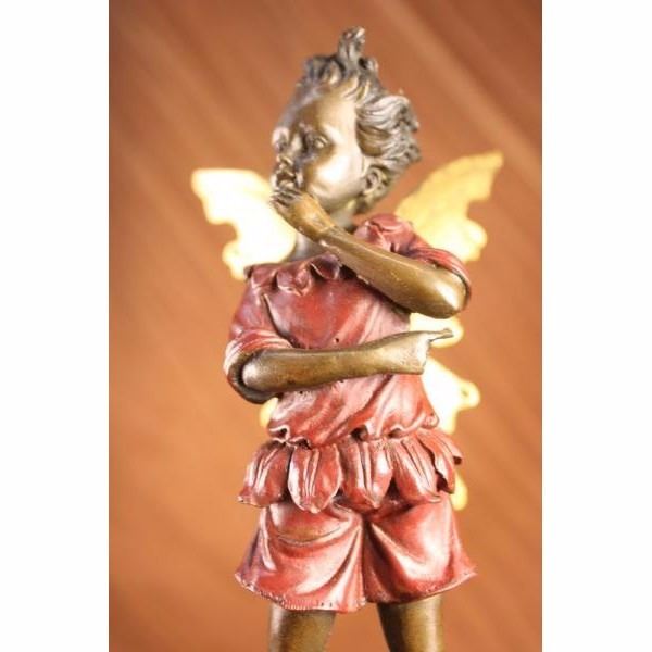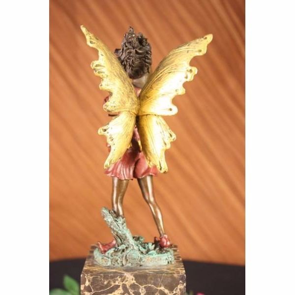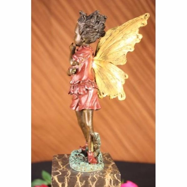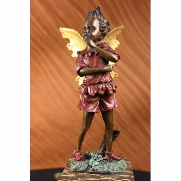 Daydreamers will fall in love with this daydreaming fairy.She wanders around the mystical forest, her eyes taking in all the magic around her. She is lulled by the soft sounds of life and fantasy around her. With youthful innocence she giggles with glee. Her fairy wings arch behind her.She wears a red patina dress. This would make a sweet addition to any little girls room. 100% bronze and handmade, this sculpture was cast using the "Lost Wax Method" and mounted on a marble base and is signed Moreau. Condition: This sculpture is in perfect condition. Bronze Dimensions with Marble Base:Height 12" x Width 4" Marble Dimensions: 5" X 5" Height without base: 7" Weight : 8 LBS Inventory : 57B7222875