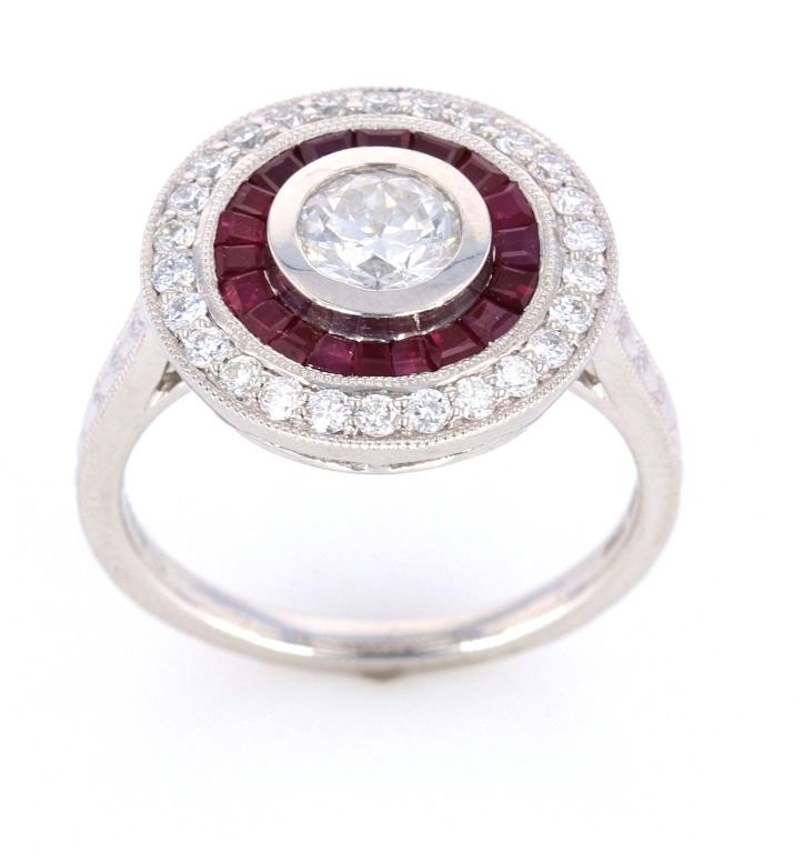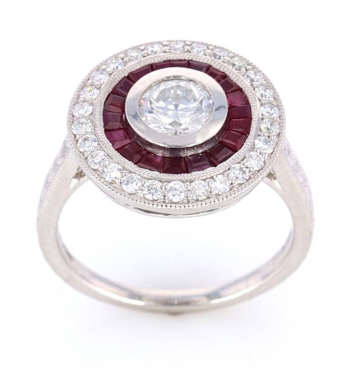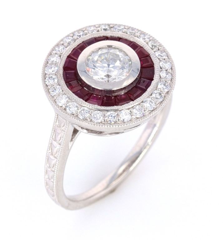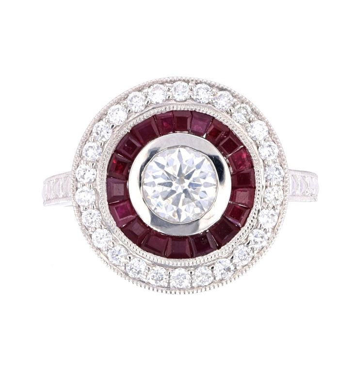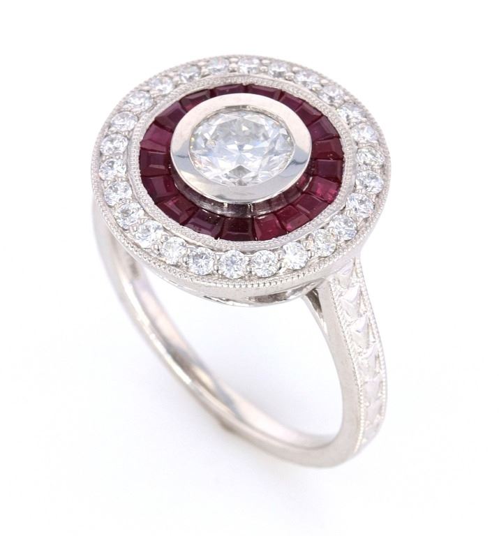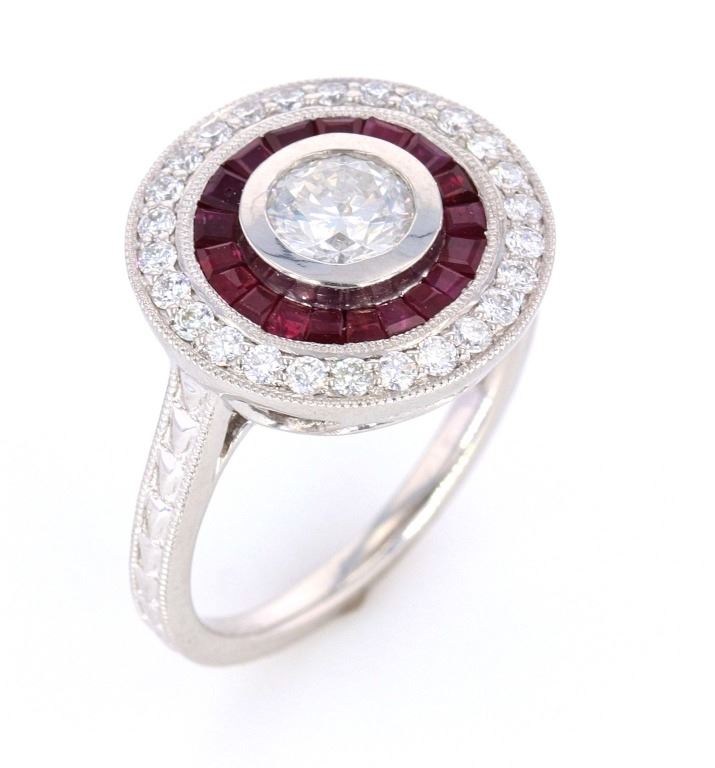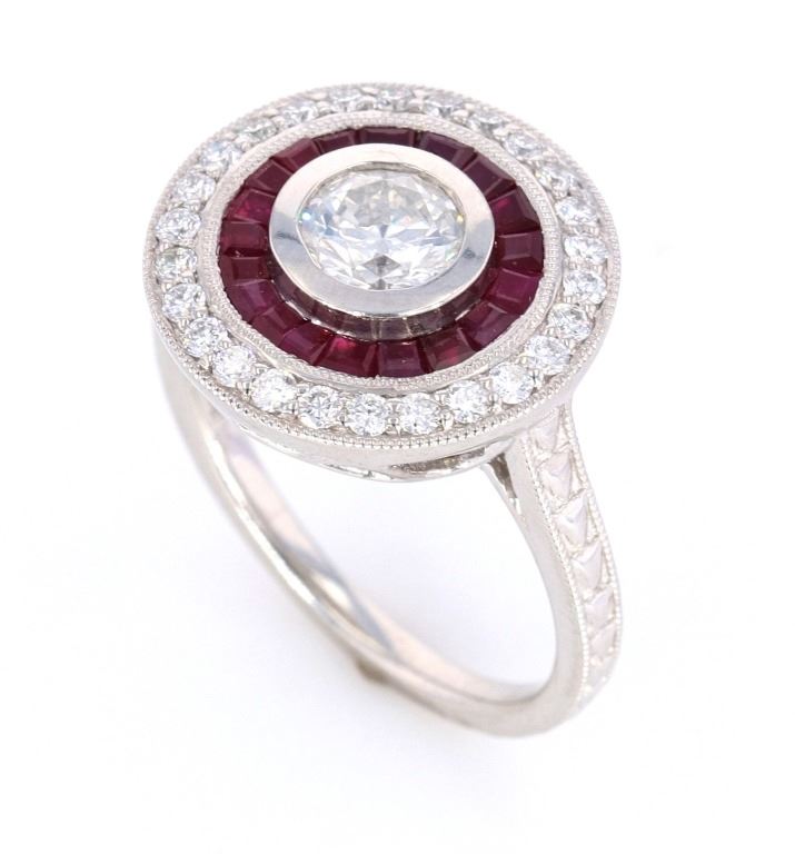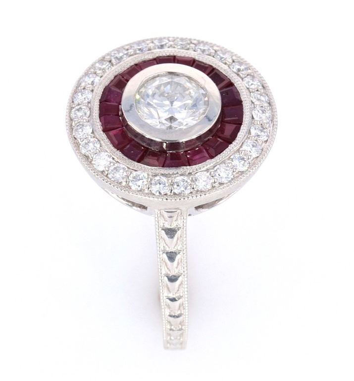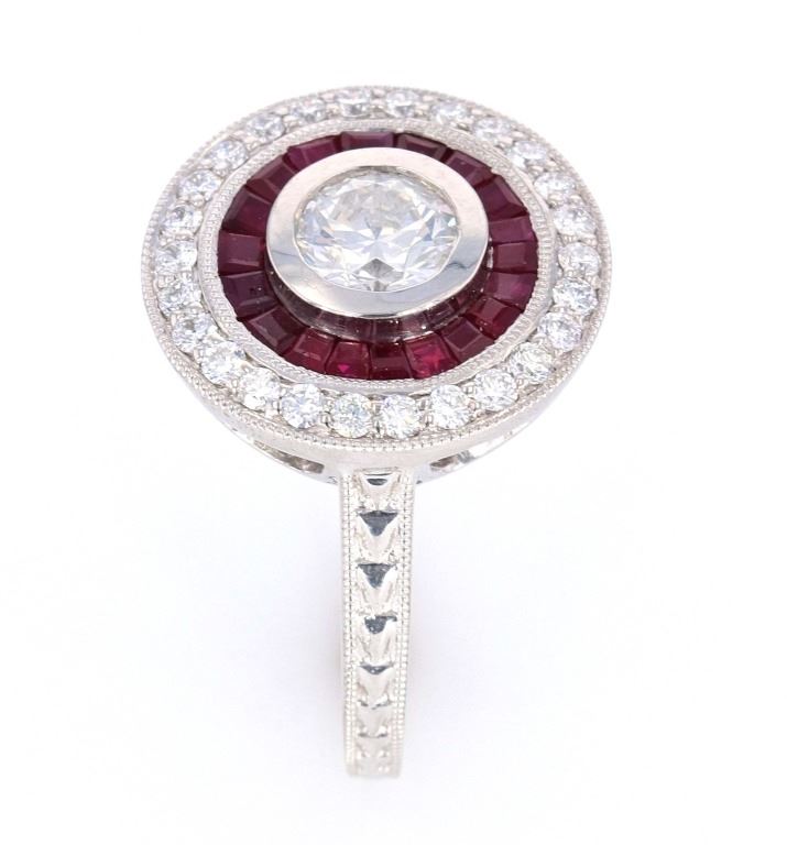 This is an excellent brand-new luxury designer ring in an amazing Art Deco Antique style and set with natural Diamonds and natural Rubies in platinum. The ring shows a bezel set center natural diamond that is 0.60 carats, clarity SI2 and H color being surrounded by channel set natural ruby stones in a square trapezoid step cut totaling 19 pieces in a weight of 1.19 carats. At the outside border of the channel set rubies shows a roll engraved bezel set with diamond set halo bezel totaling 26 stones with a weight of 0.34 carats, VS2 to SI1 clarity and F-G color. The ring itself is supported by a platinum under gallery and the band is finely engraved down each side in a truly Art Deco design. The piece comes with an AIGL (American International Gemological Laboratories, INC., a GIA certified lab AIGL#: K39E99-EA12637) report and appraisal which values the ring at $10,380.00. The ring shows a size of 6.5 US.