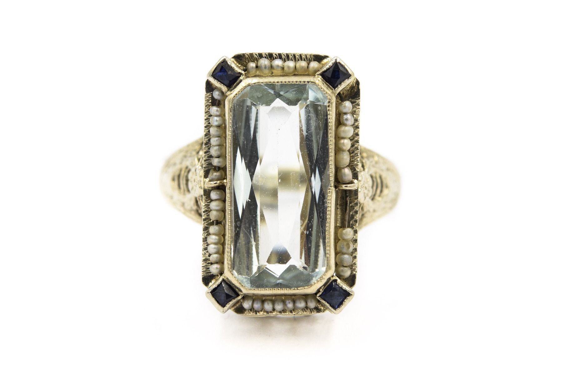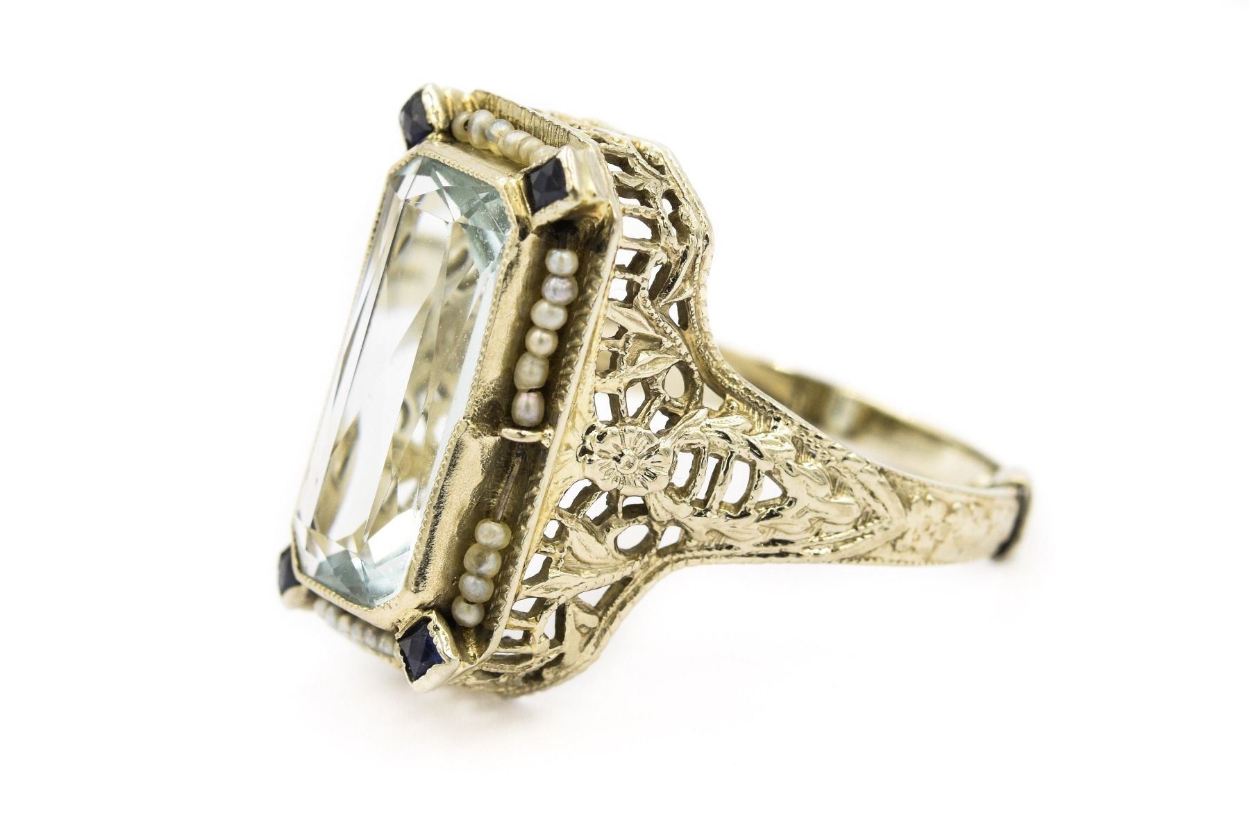 Art Deco 14K White Gold Aquamarine and Natural Pearl Filigree Ring. The ring is centrally set with a large rectangular faceted aquamarine measuring 15.30mm x 7.75mm. It is framed with natural pearl borders and set in a 14k white gold mounting that weighs 4.10g/2.60dwt. The ring is a size 5 3/4.