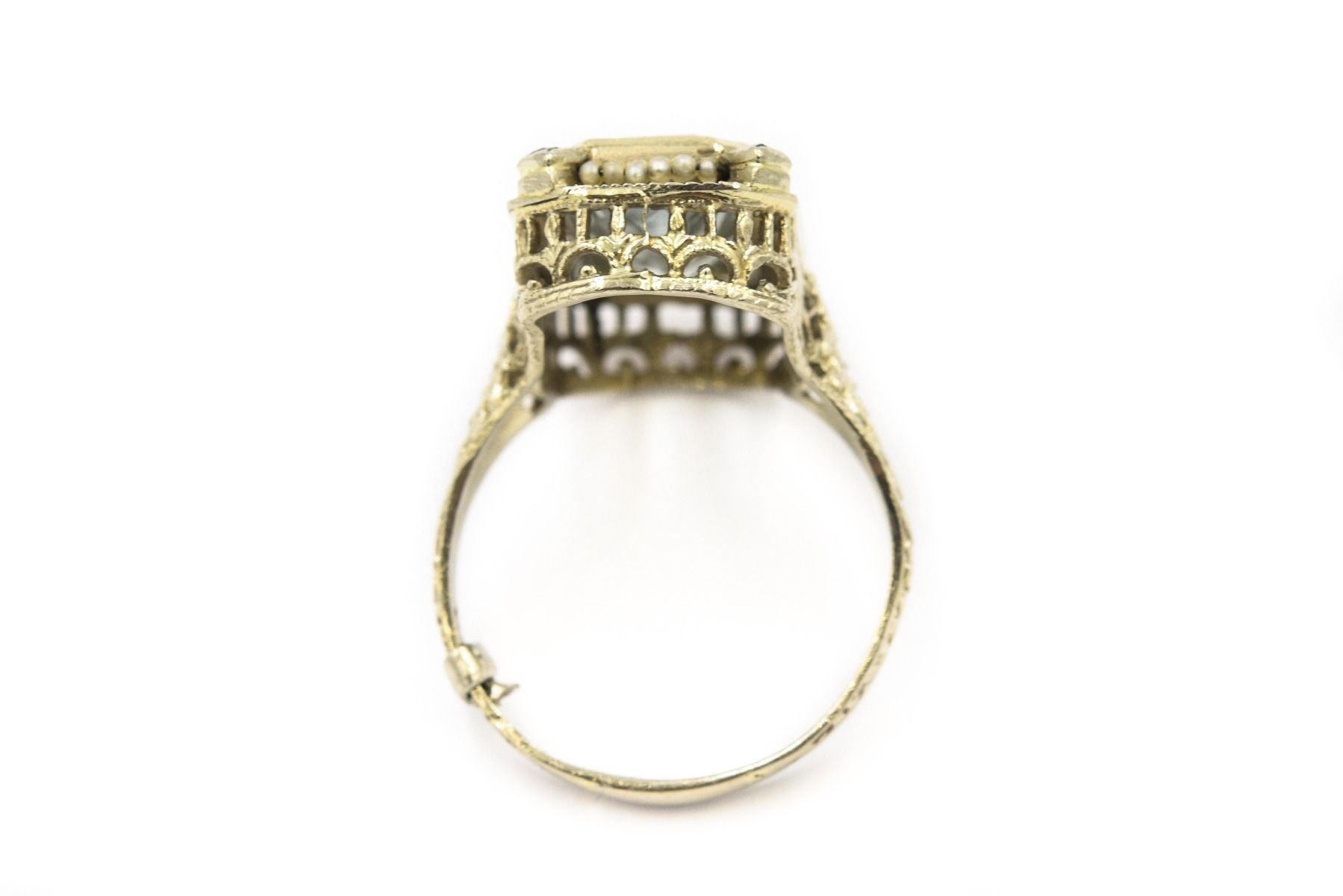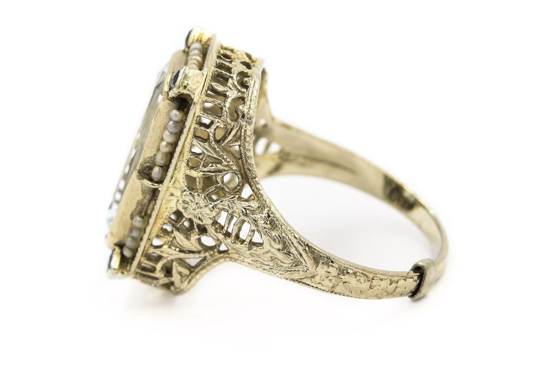 Style: Art Deco 14K White Gold Aquamarine And Natural Pearl Filigree Ring