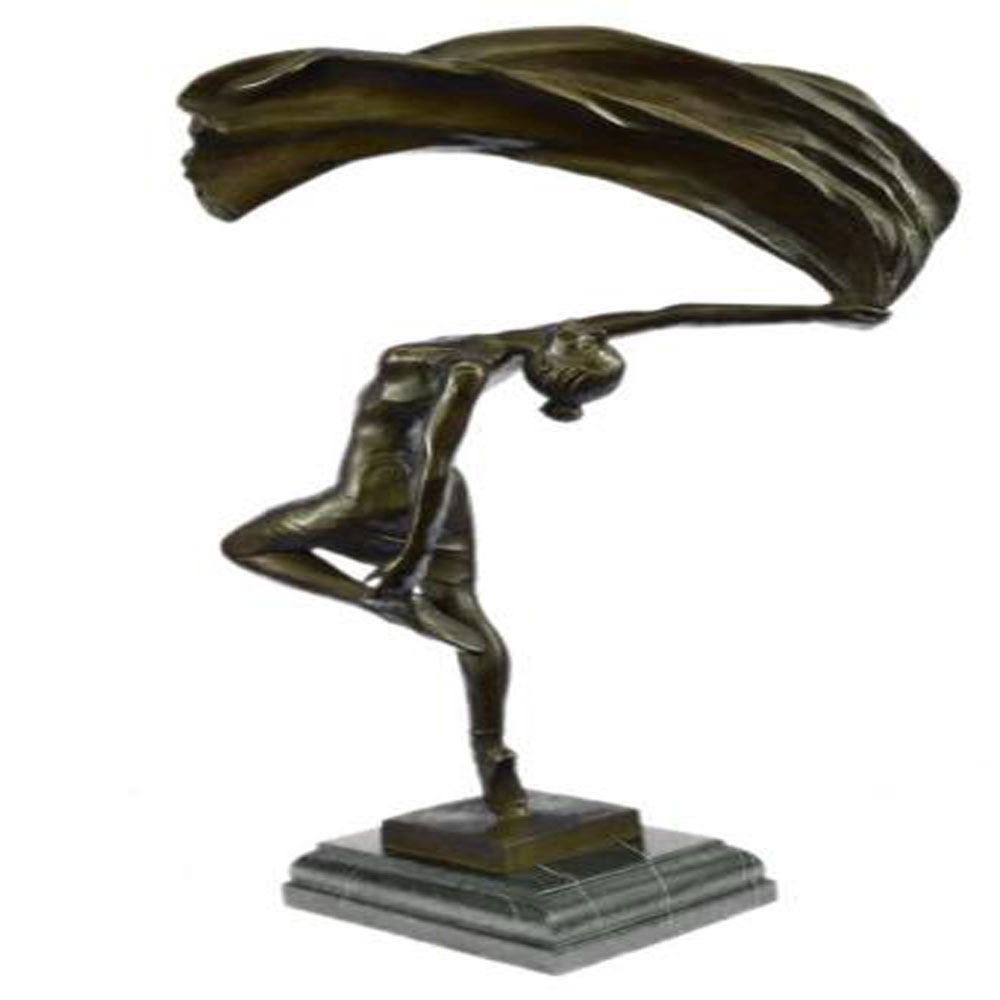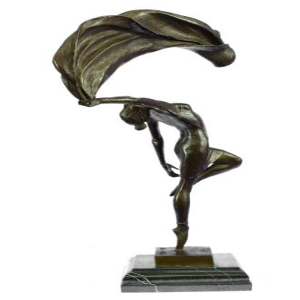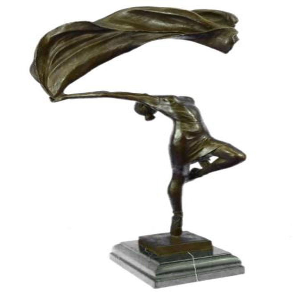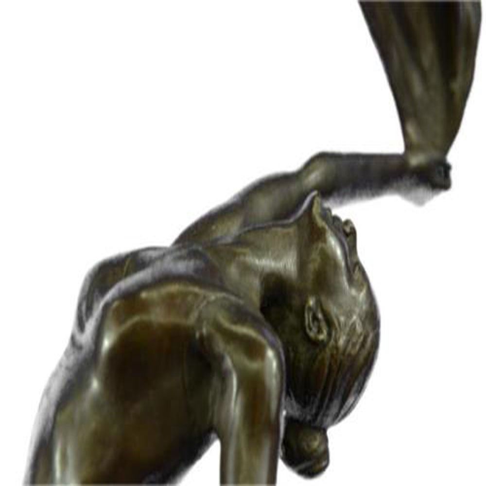 The sexy dancer is seen leaping into the air as a fabric banner, coated in a vibrant red patina, twines itself around her sculpted body. This work of art rejoices the female figure and shows attention to the body under the influence of movement. But most importantly, it’s essence characterizes the spirit within the body that wishes to bound out into everything and everywhere. She was cast using the archaic method of lost wax casting and her skin tone stained with a brown patina finish and is mounted upon a marble base. Bronze Dimensions with Marble Base: Height 19 X Width 12 Inches. Weight: 15 LBS.