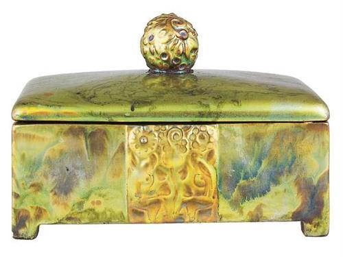 Porcelain faience. Green eosin glaze on the surface. On the sides there is relief-like decoration, on the final art deco ornamentation. Glued final. Seal like mark with eosin on the bottom. Zsolnay, Pécs, circa 1910 Size: 18 x 11.5 x 13 cm