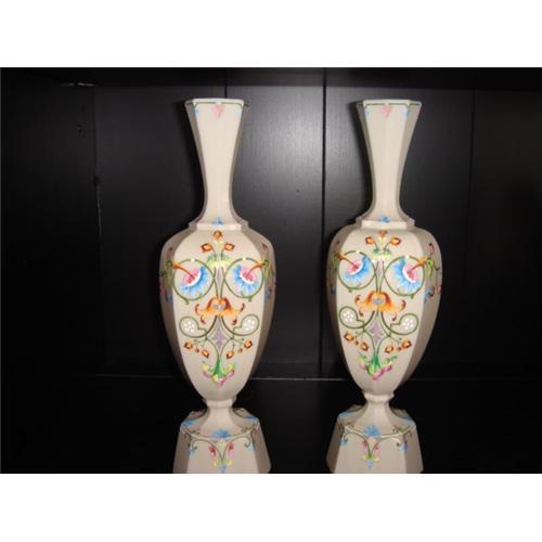 A beautiful pair of unusual art deco vases. Bristol glass beautifully hand enameled. These came out of an antique shop that had been in storage for 46 years. A wonderful addition to anyone's decor.