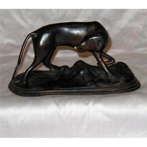 Art deco bronze greyhound (?) dog walking on rocks with head turned. Pictures do not capture its elegance. There are some scratches which do not detract due to age. Buyer pays shipping and handling costs.