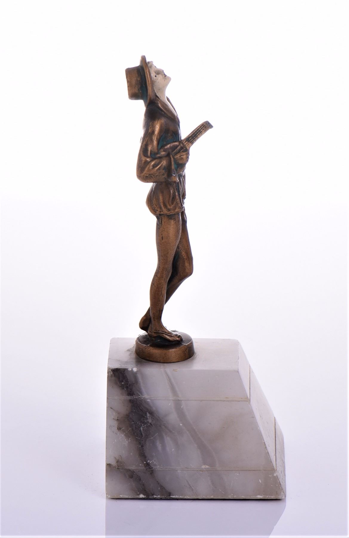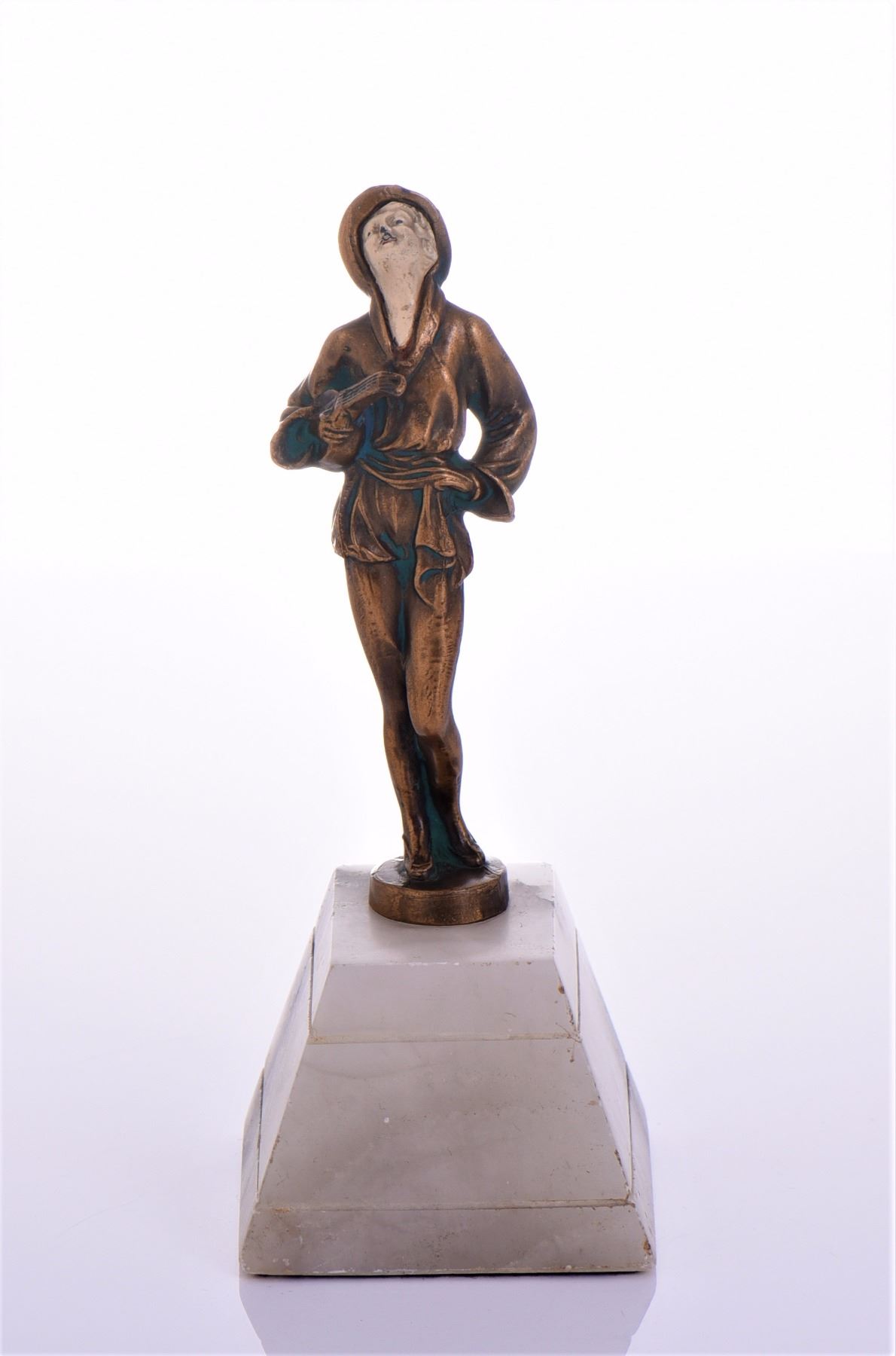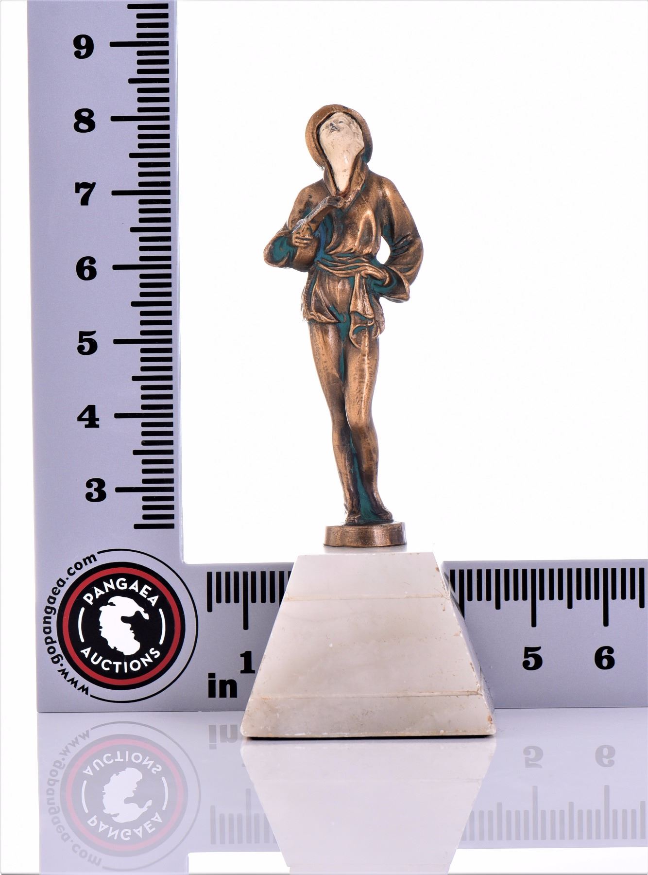 Art Deco Bronze Mandolin Player With Alabaster Pyramid Base. Estimated more than 75 yrs. old. Art Deco is a style of visual arts, architecture and design that first appeared in France just before World War I. It became popular in the 1920s and 1930s, and influenced the design of buildings, furniture, jewelry, fashion, cars, movie theaters, trains, ocean liners, and everyday objects such as radios and vacuum cleaners. It combined modernist styles with fine craftsmanship and rich materials. During its heyday, Art Deco represented luxury, glamour, exuberance, and faith in social and technological progress. Art Deco was influenced by the bold geometric forms of Cubism; the bright colors of Fauvism and of the Ballets Russes; and the updated craftsmanship of the furniture of the eras of Louis Philippe and Louis XVI; by the exotic styles of China and Japan, India, Persia, ancient Egypt and Maya art. It featured rare and expensive materials such as ebony and ivory and exquisite craftsmanship. Art Deco became one of the first truly international architectural styles, with examples found in European cities, the United States, Russia, Latin America, Africa and Asia. (Wikipedia) Size and/or Weight: See Measurement Photo. (Photos Represent The Lot Condition, Pangaea Auctions)