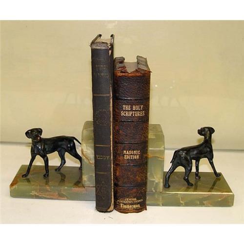 Nice pair of Art Deco patinated bronze dogs mounted on verdi green onyx bookends.