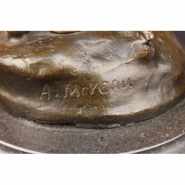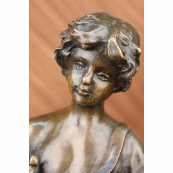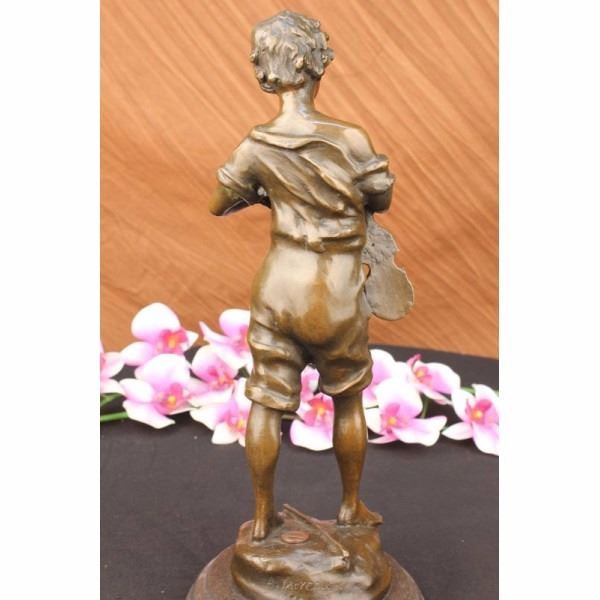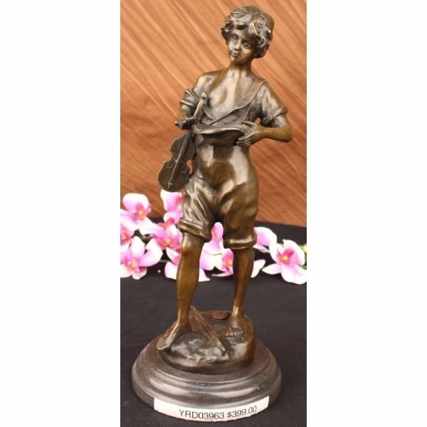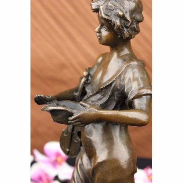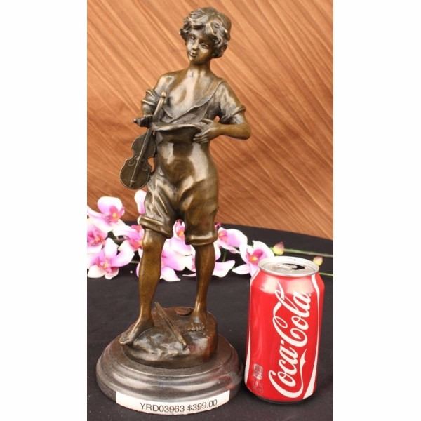 A boy plucks and tunes the strings of his violin. The well-detailed violin, includes four metal strings.Tucked under his chin, he happily looks down to make sure his music will be fined tuned and not hit any sour notes. A beret is cropped onthe top of his head. He wears a shirt-dress, coat, long trousers,knee-high boots and a sash that bunches to the side of his thigh. Herests a buckled boot on the edge of a corner stepping stone. A discarded cloth is crumpled beneath him. Could he be stealing a momentfrom shining shoes to showcase his true talents? 100% bronze and handmade, this brown patina sculpture was cast using the Lost WaxMethod and is mounted on a round brown patina base and then mounted on a second black marble base. This sculpture was signed by the artistA.Moreau. Condition : This sculpture is in very good condition. Bronze Dimensions with Marble Base:Height 14" x Width 5 1/2" Marble Dimensions: Diameter 5 1/2" . Height without base: 13" Weight : 8 LBS Inventory : 75Y0393657