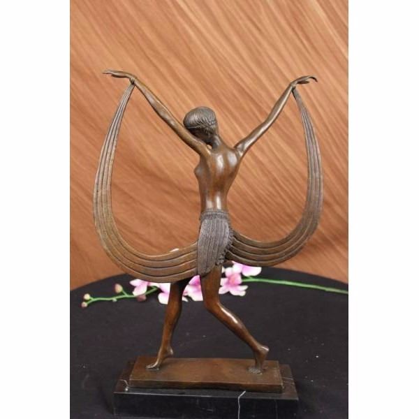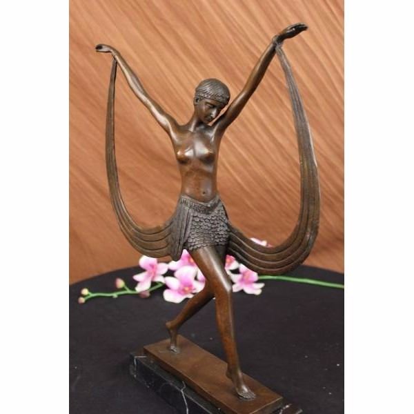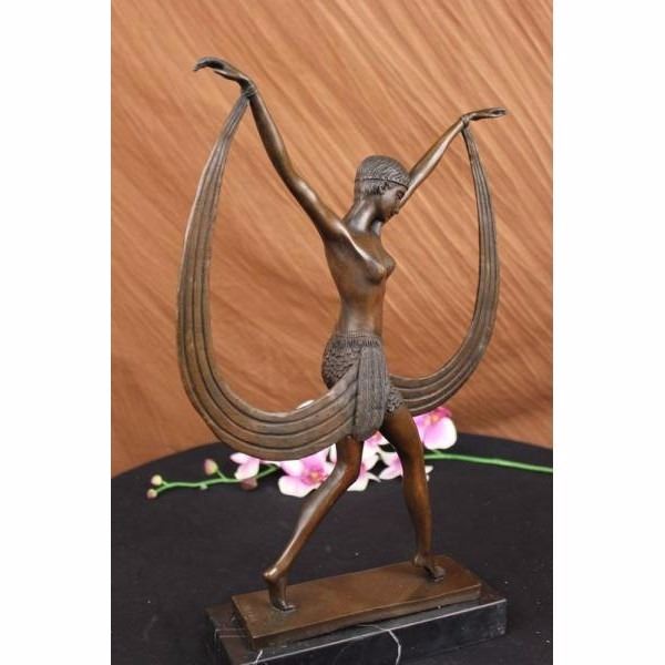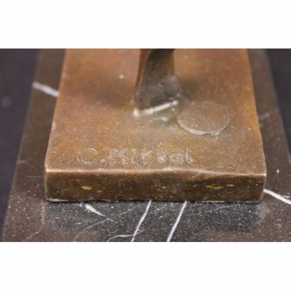 The belly dancer is light on her feet and fluid with her waistline. She stretches her arms out to her sides as she glides across the floor on the balls of her feet. A long sash is attached to her wrists, extending from her short skirt. They arch around her half-nude body, like wings. She wears a beaded headband around her short hair. This gorgeous Gypsy performs her classic belly dance, letting strangers fall in love with the sight of her. Her curvaceous body is astounding and her outfit shows it off beautifully. The bright golden yellow patina of her skirt, sash and headband, are an added touch of detail that is truly eye catching. 100% bronze and handmade, this brown patina sculpture was cast using the "Lost Wax Method" and mounted on a marble base and is signed C. Mirval. Condition : This sculpture is in a perfect condition. Bronze Dimensions with Marble Base:Height 18" x Width12" Marble Dimensions:9"x 3" Height without base: 17" Weight :11 LBS Inventory :63DS172B4036