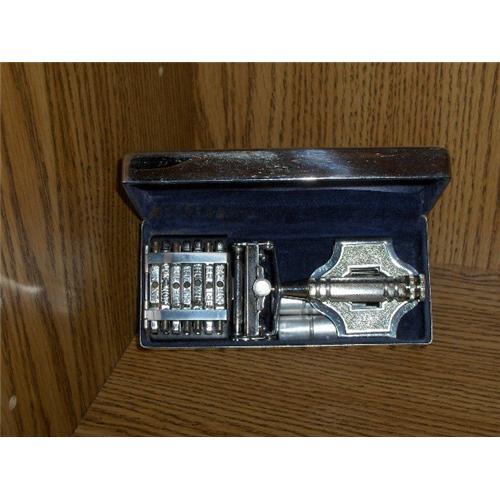 Boxed in a chrome Art Deco case, is a Wilkinson Sword 7 Day Razor. The patent # 321115 Made in England is marked on the razor. This Empire Model razor has seven blades, marked with each day of the week, fitted into the hinged chrome case. The strope casing is present, but not the strope, but there are two small aluminum cased lidded tubes, each marked. One is a course paste, one is a fine paste, used to apply to the strope before shaving. The box has scratches from use. Overall appearance is great. An excellent find for the ultimate collector. See photos. Take a look at my other items. Thank you for viewing.