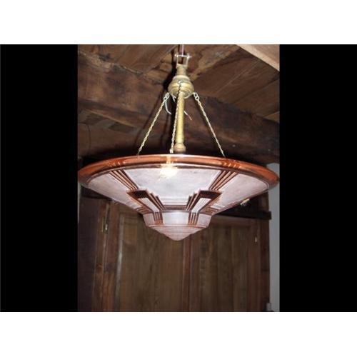 A fantastic French light fitting with a stunning ART DECO Geometric design.Impressed Degue mark,rose coloured glass ,original and adjustable chains and support all in very good order.............STUNNING FRENCH ART DECO!