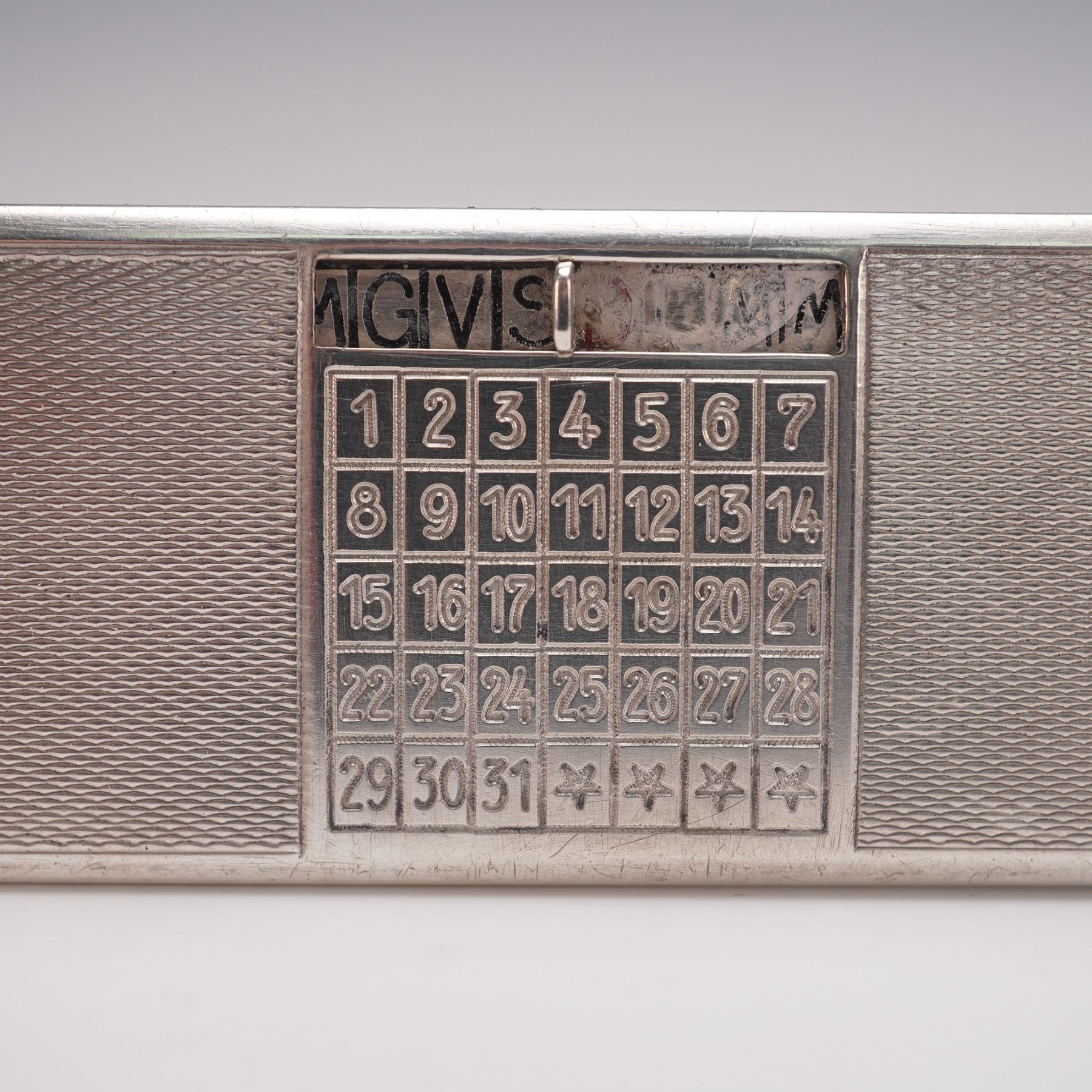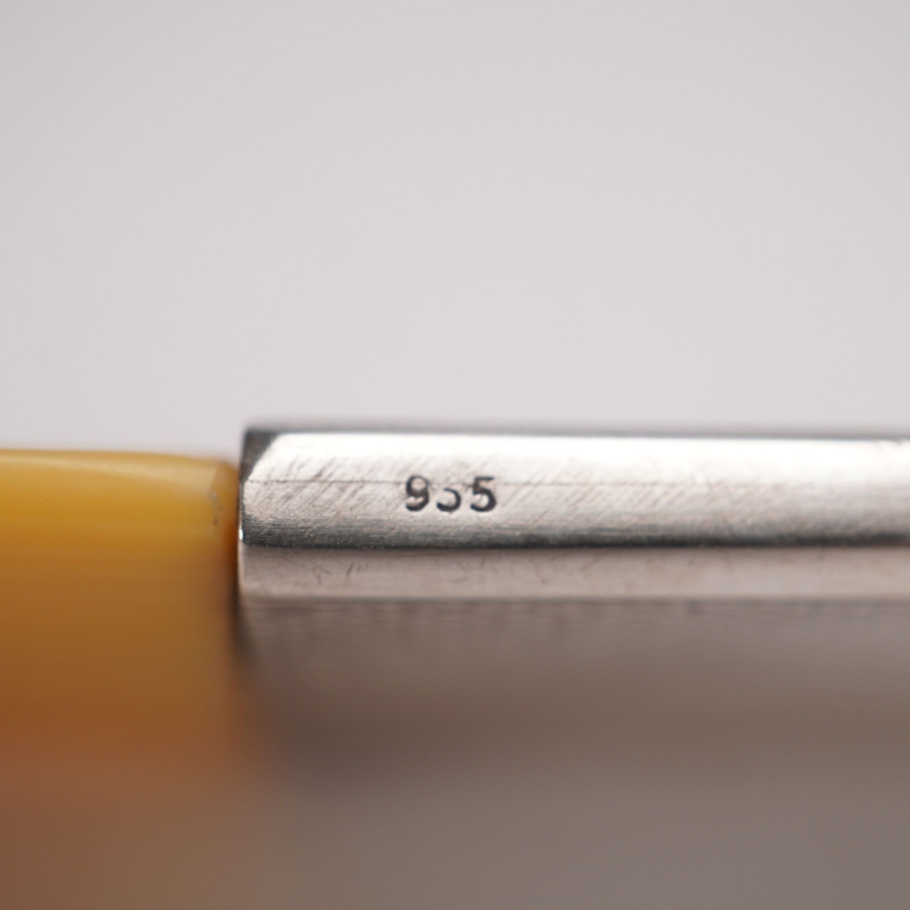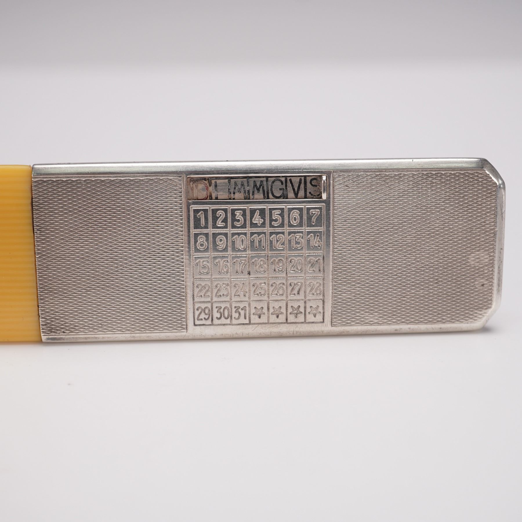 Art Deco-era letter opener featuring a yellow celluloid blade paired with a sterling silver handle. The handle is fitted with a movable perpetual calendar dial displaying days and dates, a clever design element typical of early 20th century desk accessories. The silver is stamped 935, indicating continental sterling silver of higher purity than standard .925. A fine example of functional Art Deco design blending utility and style. Gross weight 2.1 oz.