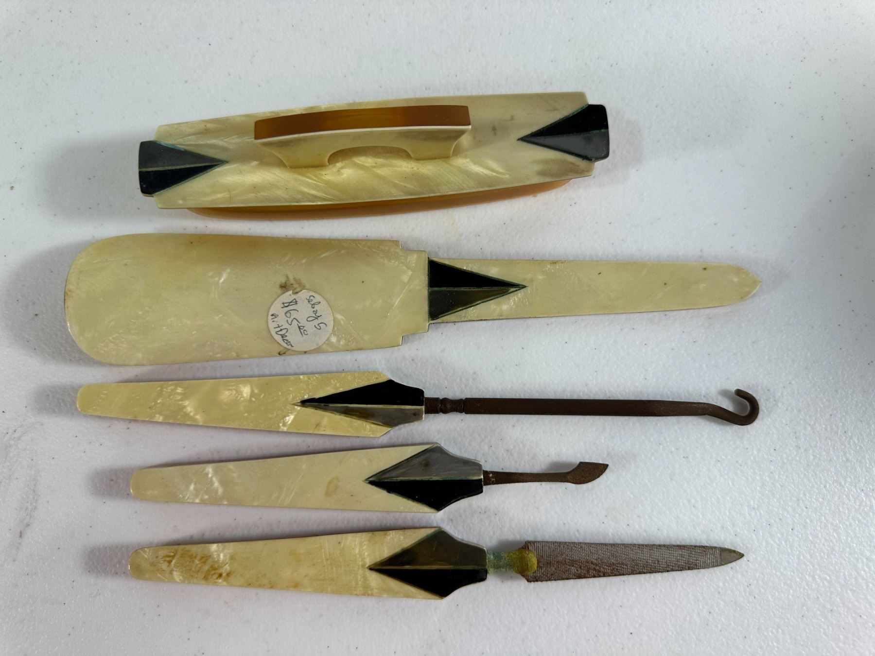 Five 'piece manicure kit with pearlescent Art Deco handles; includes file, hooks, cuticle tool and shoehorn. Metal parts show age patina.