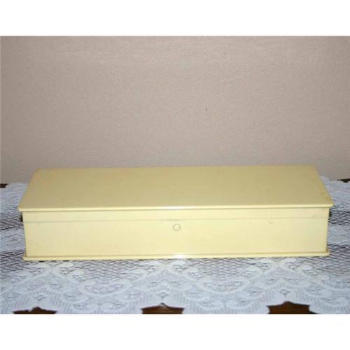 This is a fabulous antique Vanity or Glove Box produced in the Art Deco Period 1920s. Made from Celluloid with appropriate and typical discoloration of a piece from this time period, still fabulous with a hinged lid and push-button latch opening the top, still in superb working condition. Measuring 12 ¾ inches long by 4 ½ inches wide and 2 ½ inches tall; wonderful overall condition, minor spotting and free of any chips or cracks.