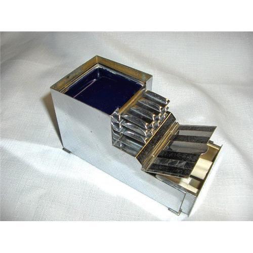 Art Deco Chrome Cigarette Box/Stacking Ashtrays made in the 1930's. This is an excellent example of streamlined art deco. This unit has a cigarette box and three stacking ashtrays and only takes 4.5in. X 2.25in. of space. Of the ashtrays, 2 are black enamel and chrome, one is blue enamel and chrome. The box unit is chrome and the lid to the cigarette box is black and chrome stripes. The condition is very good, due to the fact the lid to cover the ashtrays is missing, but does not detrack from the beauty of the set. This is all original, no repairs, no rust, no dents or dings. There are no maker's marks. THE CIGARETTES IN THE PHOTO ARE JUST FOR DISPLAY PURPOSES, NOT INCLUDED IN SALE. Have a look at my other items. Thank you for viewing. Buyer pays actual S&H, Insurance costs.