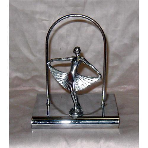 Great art deco chrome napkin holder with charleston girl figurine one it. Much brighter then the pictures. Minor scratches due to age. Buyer pays shipping and handling costs.