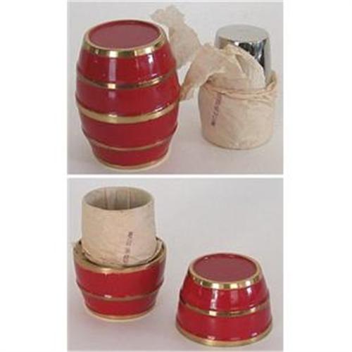 Vintage 1930s Art Deco Chrome Shot Glasses in Barrel, wonderful little nested set of 6 chrome shot glasses in a miniature metal red enameled barrel. Each shot glass and the barrel are imprinted ?Germany.? Barrel measures 2-1/2? tall. Shot glasses have NEVER been unwrapped, and are still inside original paper wrapping imprinted ?Made in Germany.? Barrel in excellent condition with a couple of very minor paint flecks mentioned only for the sake of completeness.