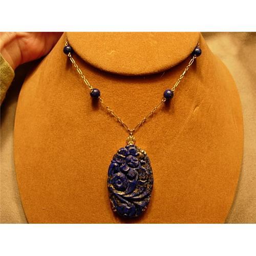 Lovely lady's circa 1930s 14kt yellow gold and lapis necklace set with carved lapis (floral design) plaque Art deco detailed bail, modified paper clip fancy link chain with 4 lapis beads and spring ring clasp. Very Deco look! Wonderful Deco design!