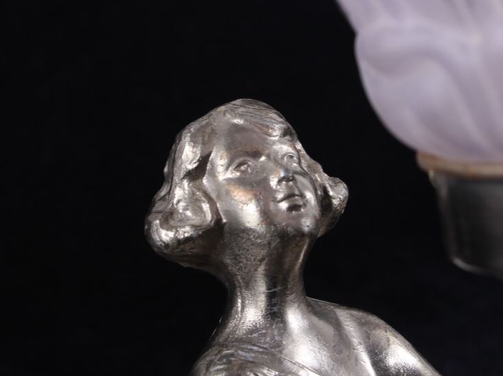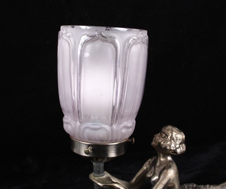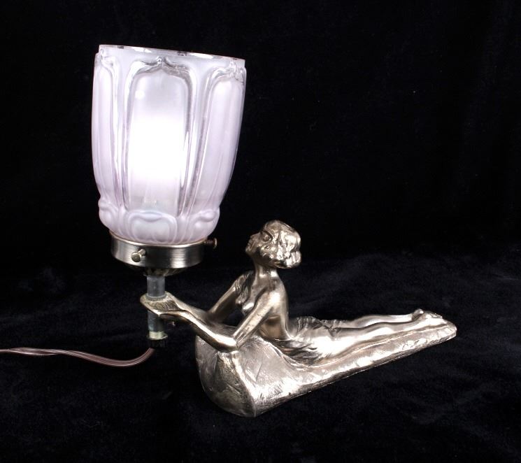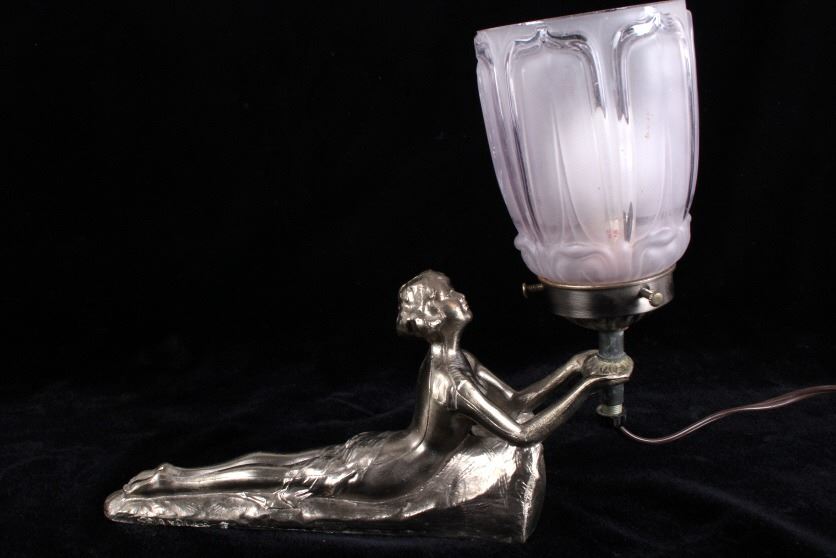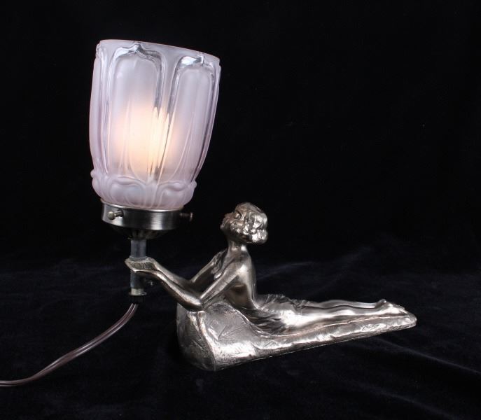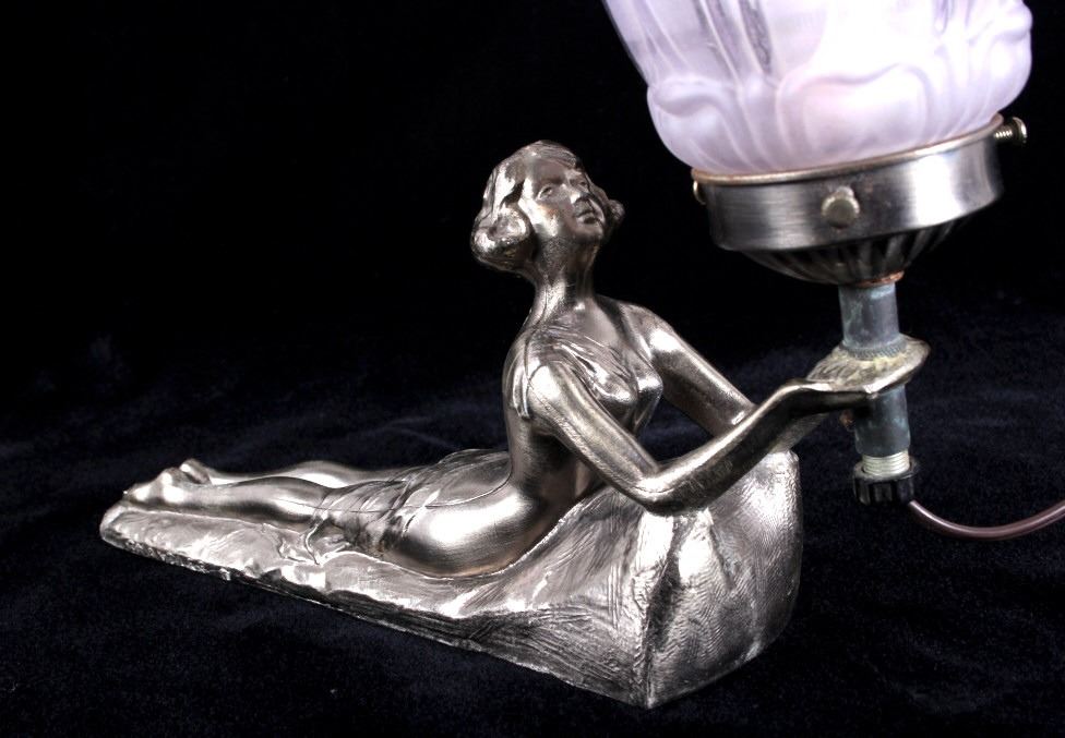 This lot features an art deco custom designed lamp. The custom cast was made by Chandler. The lamp display a women laying down grasping the light. The light has a intricate glass shaded and the cast has great detail. The piece does light up. The lamp makes for striking decor piece. It is in good overall condition. Measures: 11" W x 10" H x 4" D