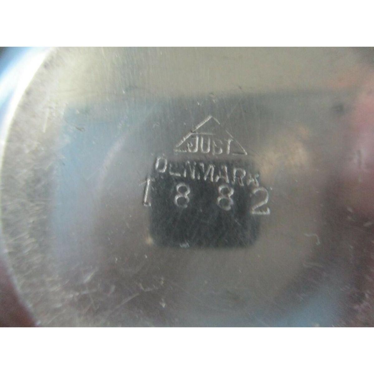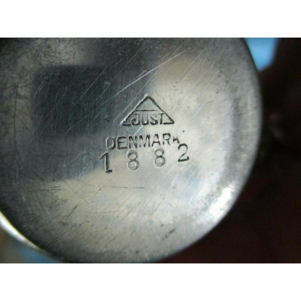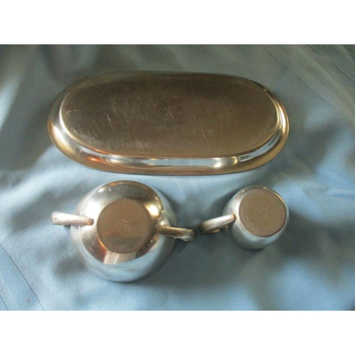 Lovely set of early 20th Century, Art Deco era, Danish pewter. "Just Anderson" creamer & sugar set with matching tray. Each piece signed & numbered, stamped Denmark. Tray measures 9" X 5". Creamer 2" H X 3 1/2" W. Sugar 1 1/2" H X 3" W.