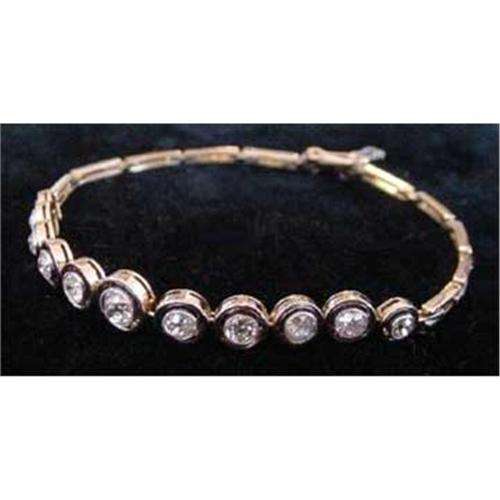Art Deco 18 K yellow gold and platinum bracelet with diamonds. The bracelet consists of eleven circular platinum and gold sections bezel set with diamonds. There are eleven old European cut diamonds with a total weight of 2.20 carats. The GIA clarity grade is SI, and the color is H. The bracelet has a safety lock mechanism and a safety chain. The craftsmanship is fine and the condition is excellent. The bracelet is 7 ½? long. Circa 1920 - 1935. Note: Mounted gemstones are graded only to the extent that the mounting permits examination.
