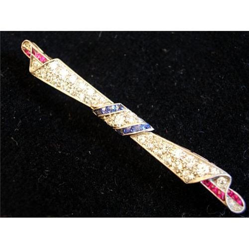 <tr><td>Title:Art Deco Diamond Ruby Sapphire Platinum Brooch</td></tr>