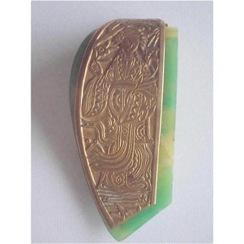 An exceptional offering for your consideration. A stunning apple green Bakelite with amber yellow marbling. A substantial piece dressed with an overlay of brass, etched and highly detailed depiction of a Japanese Geisha elaborately costumed and holding flowers in a background of an Oriental garden. This piece is signed on the back with the initials LW and Paris. Fittings are brass and the clip is strong and firm. A fabulous example of Art Deco jewellery in an era when all things exotic were so fashionable. This lovely European piece, made in Paris, has stood the test of time extremely well and is in beautiful condition. Measures 1-1/4" inches wide by 2-3/4" inches tall and has a thickness of 3/4" inch. Offers will be considered. Thank you for visiting Mandy's Madcap Vintages. <p>Shipping is determined after checkout; insurance is included. <p>