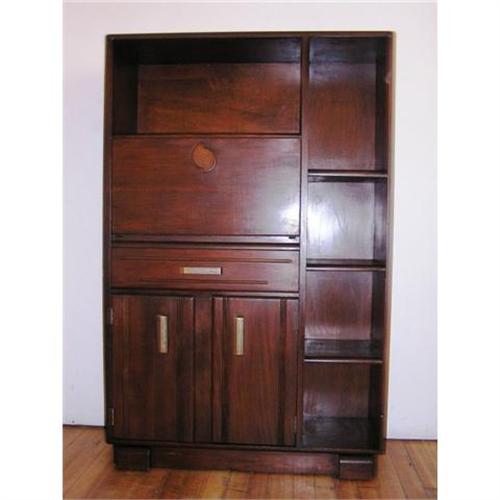 This beautiful art deco piece has a drop front secretary, plenty of shelves, one middle drawer and two bottom doors with additional shelve space. Made of walnut. Excellent condition. The dimensions are: W-33.5 D-12 H-52