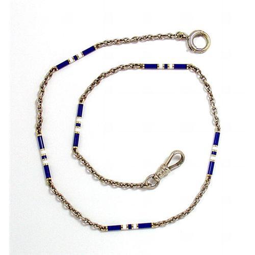 American Art Deco era gold watch chain. Alternating lengths of cobalt blue and white enamel and gold banded batons with link cable chain. Spring ring clasp at one end, swivel at end where watch can be attached. Marked 14K on clasps and swivel.