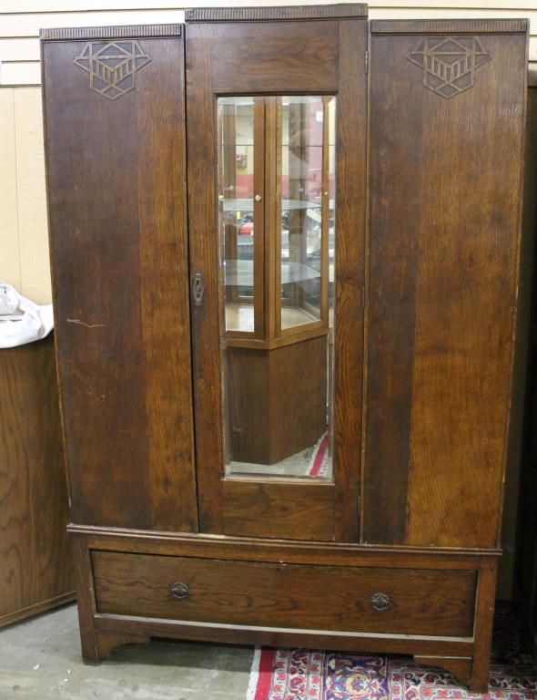 With center beveled mirror, clean lines, with coat rack inside, it is two pieces, the condition is good, however has minor losses to top left to wood, 24" X 17" X 72".