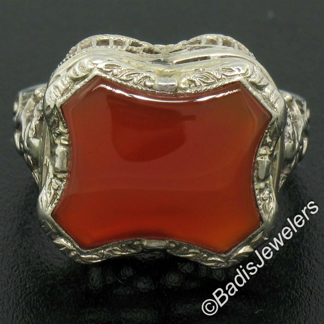 An art deco period, etched, 14kt white gold ring with a custom cut carnelian solitaire. The ring is size 5.5, weighs a total of 3.67 grams, and measures 12.7mm wide.
